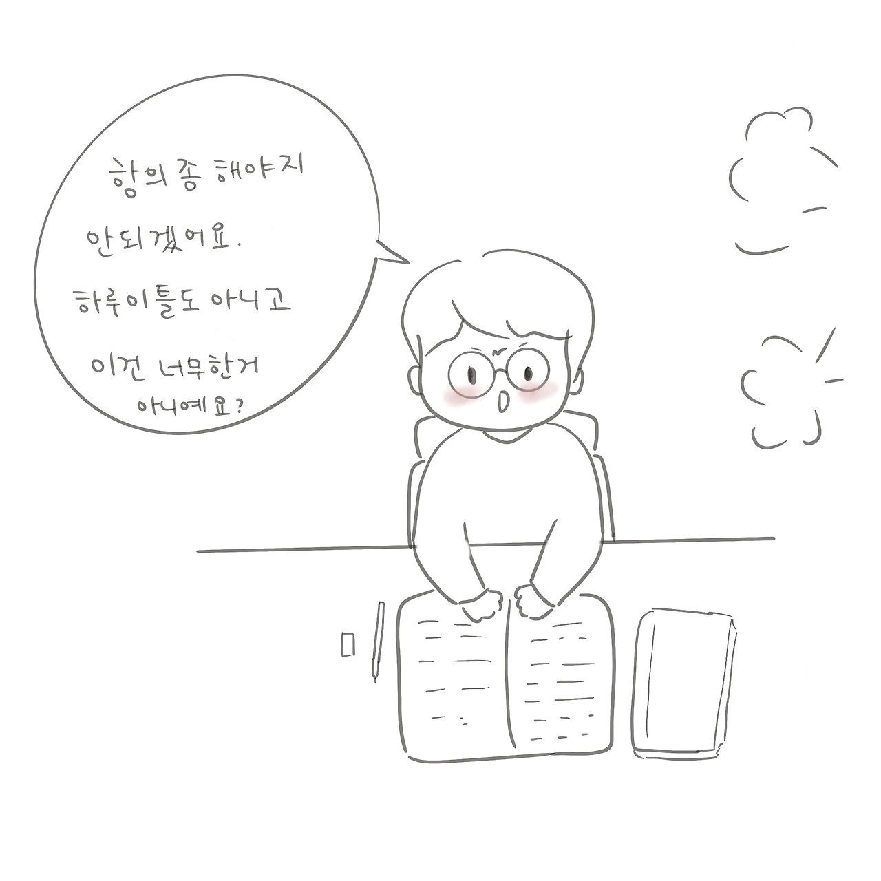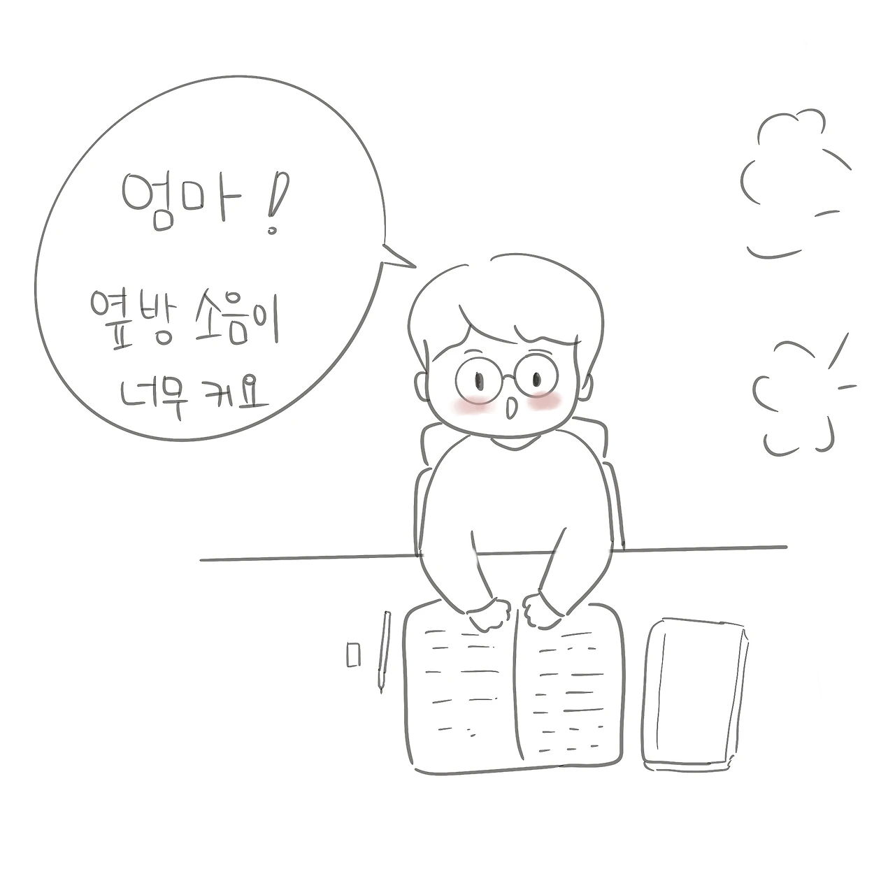 아직은 수험생같아 보이지 않지만 그래도 공부를 하는 수험생은 옆방에서 하루종일 큰소리로 부르는 노래에 매일 항의를 한다.