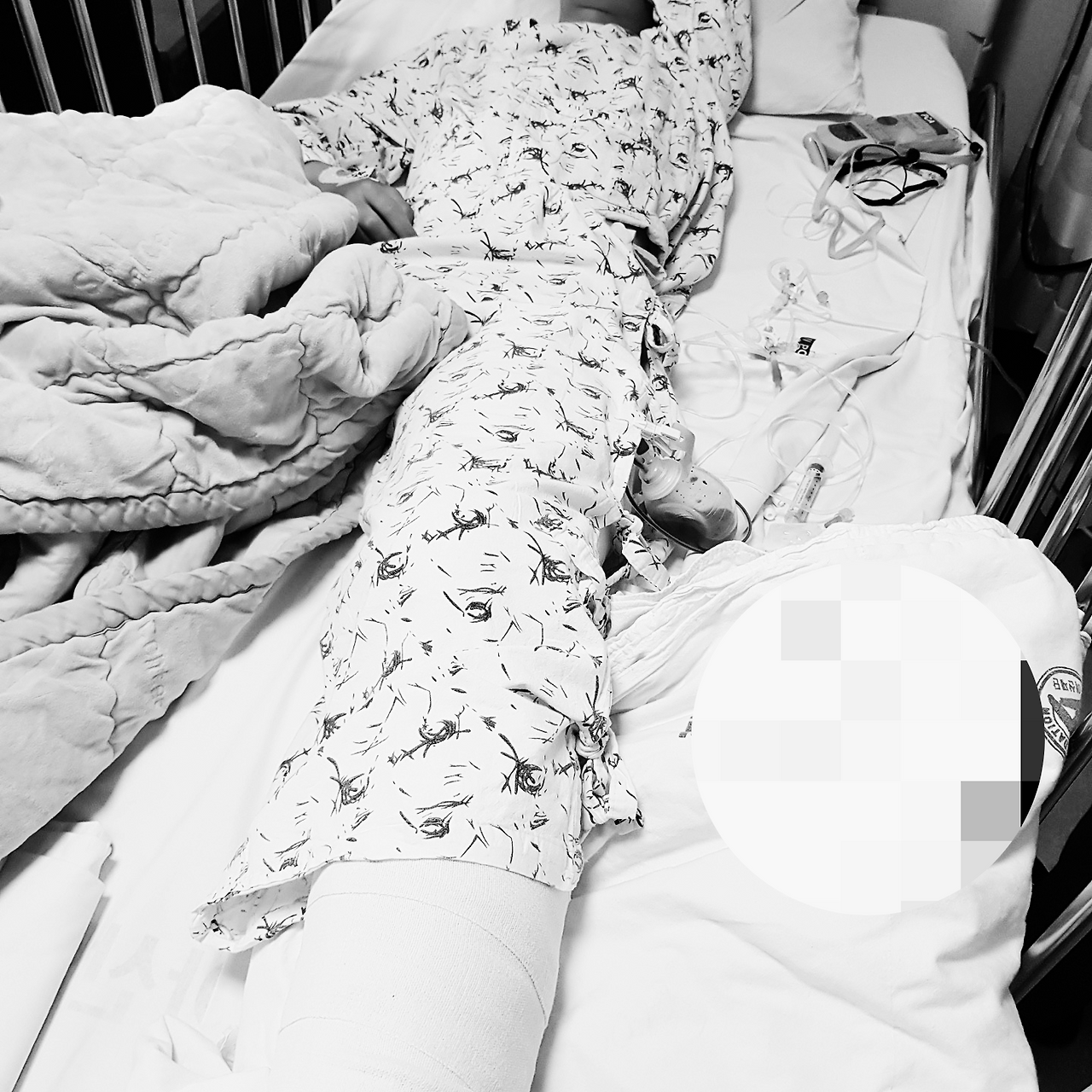 수술한 곳의 통증이 너무 아파 진통제를 달고 있었지만 어린 나이이기도 하고 진통제의 성분이 독해 시간이 정해진 시간에만 자동 투입되는 진통제의 버튼을 밤새 누르기도 하고