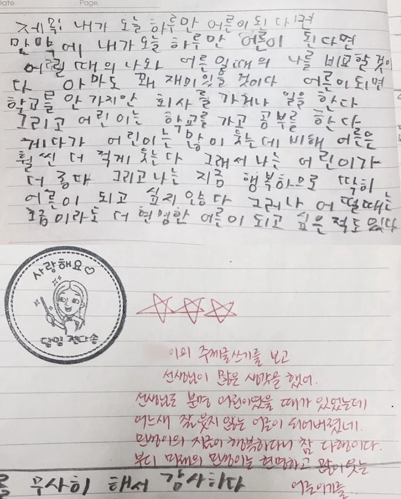 선생님도 잘 웃는 어린이였던 시절이 있었는데 나 자신도 모르고 아무도 모르게 어른이 되어버렸네 오래오래 어린이일 줄 알았는데 어른은 참 멀리 있었는데 바람 한 번 불고 나니 어른이 되어버렸어