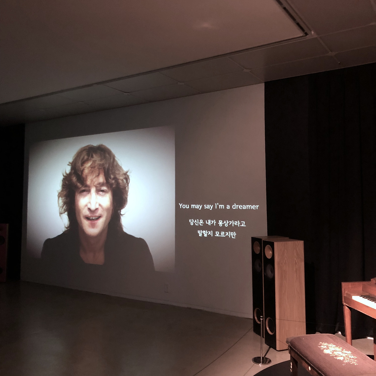 -모든 사람들이 평화롭게 산다고 상상해봐요. 날 몽상가라고 말할 수도 있어요. 하지만 난 혼자가 아니에요. 당신도 언젠가 우리와 함께 하길 바라요. 그러면 세상은 하나가 될 거예요.