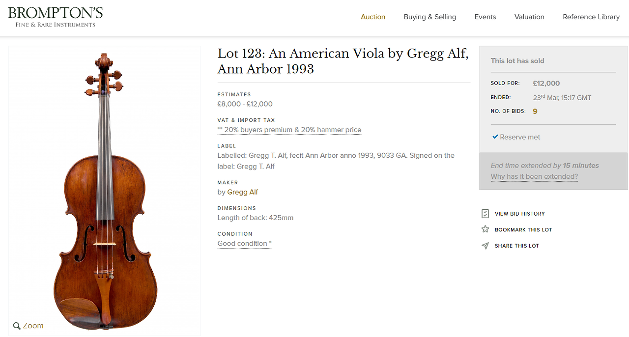 입찰하려는 악기 페이지를 보면 악기 제작자 정보, 악기 라벨이나 크기 등 간단한 이력, 악기 상태 등을 알려준다. 악기 상태가 가장 좋으면 Excellent condition, 그 다음이 Good condition, 수리 이력이 있으면 간단한 수리 상태가 기재돼 있다. 아울러 보증서나 감정서가 있으면 포함된 사실과 서류 사진도 보는게 가능하다.