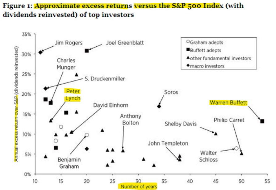 이제 현실로 돌아올 시간이다. 다음 그림을 보자. 유명한 투자 대가들의 성과를 비교한 도표다. 세로축은 S&P500 대비 초과수익률이고, 가로축은 초과수익을 달성한 햇수다.