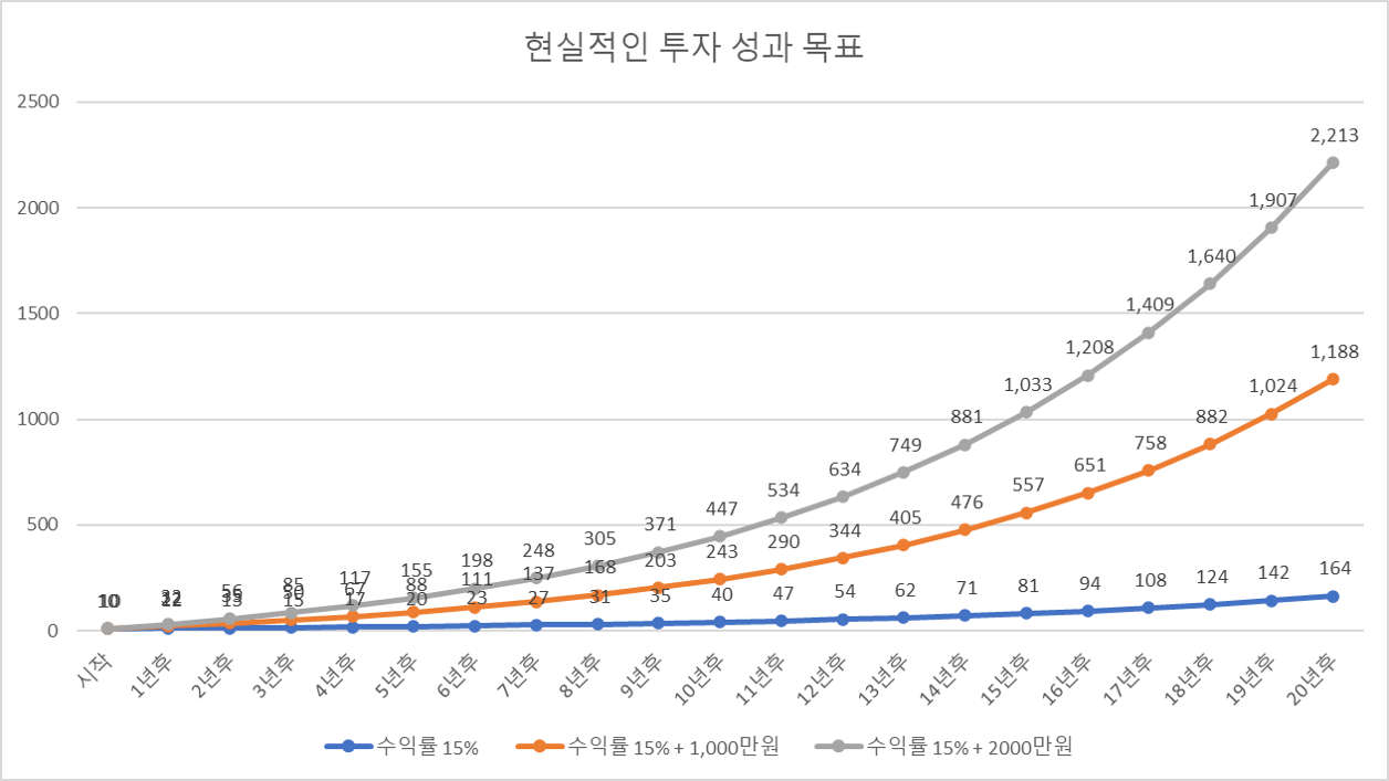 연간 15% 수익률을 달성한다고 가정하고, 매년 투자 재원에 투입하는 금액에 따른 투자 성과 비교다. 투자 재원 추가 없이 1,000만원으로 연간 15%를 달성하면 20년이 지나도 1.6억 정도밖에 되지 않는다. 그런데 매년 1,000만원씩 투자금을 추가하면 19년쯤에 10억을 달성한다. 2,000만원씩 투자금을 추가하면 15년에 10억이 된다.
