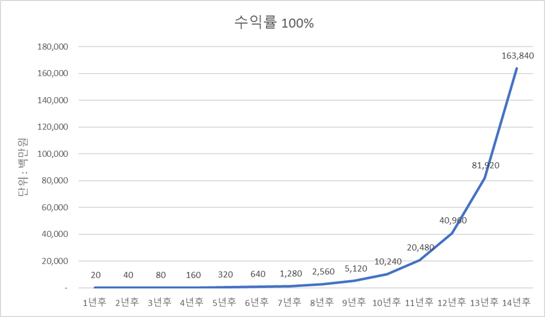 한 번쯤은 다음과 같은 수익률 그래프를 꿈꾸면서 주식 시장에 입문한다. 매년 수익률 100%를 달성한다는 가정이다. 1,000만원의 종잣돈으로 시작하면, 7년째에 10억을 돌파하고, 10년째에 100억을 돌파하며, 14년째에는 무려 1,000억을 돌파한다. 이런 추세면 20년째에는 무려 10조 부자가 되어 있을 것이다.