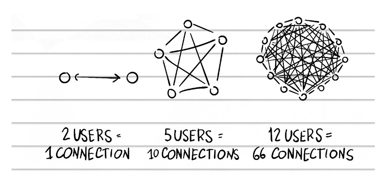 조직 구조의 본질은 커뮤니케이션 복잡도에 있다. 두 사람 사이에는 하나의 채널만 존재하지만, 다섯 사람이면 10개, 열두 사람이면 총 66개의 채널이 존재한다. 이러한 커뮤니케이션 채널은 사람의 수가 늘어남에 따라 기하급수적으로 증가하는 특징을 갖는다. 조직 구조에 대한 고민은 여기서부터 시작한다. 기하급수적으로 늘어나는 커뮤니케이션 채널은 정보가 교환되는 과정에 매우 큰 비효율성으로 작동하며, 조직이 동일한 목표에 집중하는 것을 어렵게 만든다.