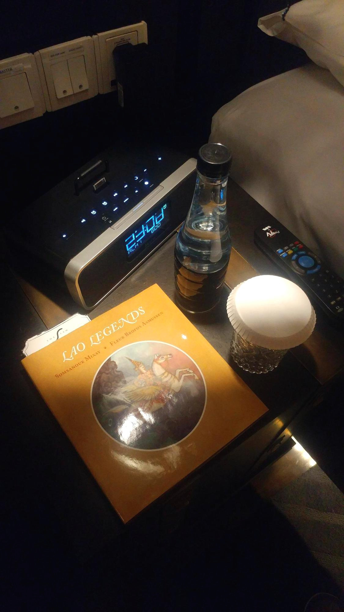 며칠을 뒤늦게 도착하는 친구를 마중 나가려 알람을 맞춰놓았다. 침대 옆 탁자엔 라오스 책이 있으며 물은 물컵과 함께 종이 뚜껑까지 있어 투숙객을 세심하게 배려하고 있다. 모든 게 감동이다.