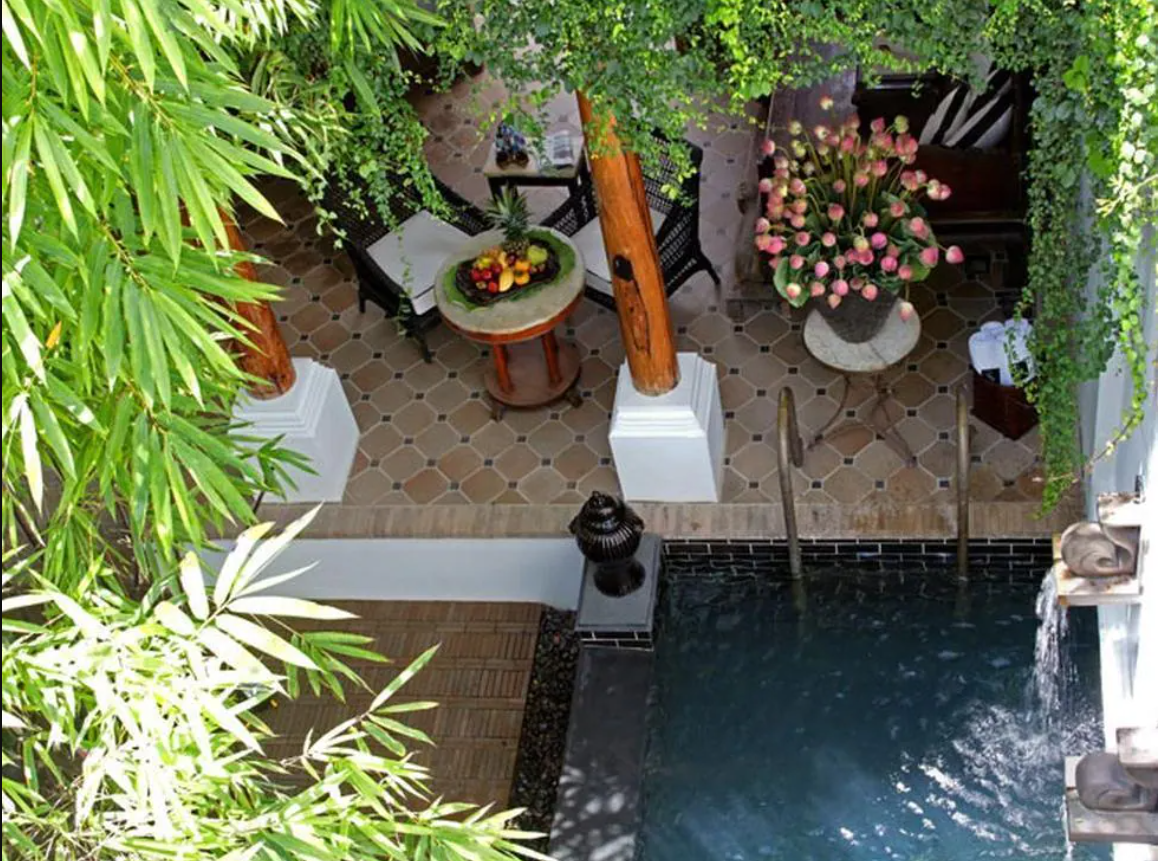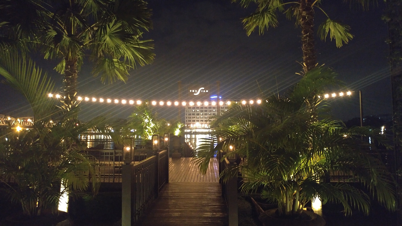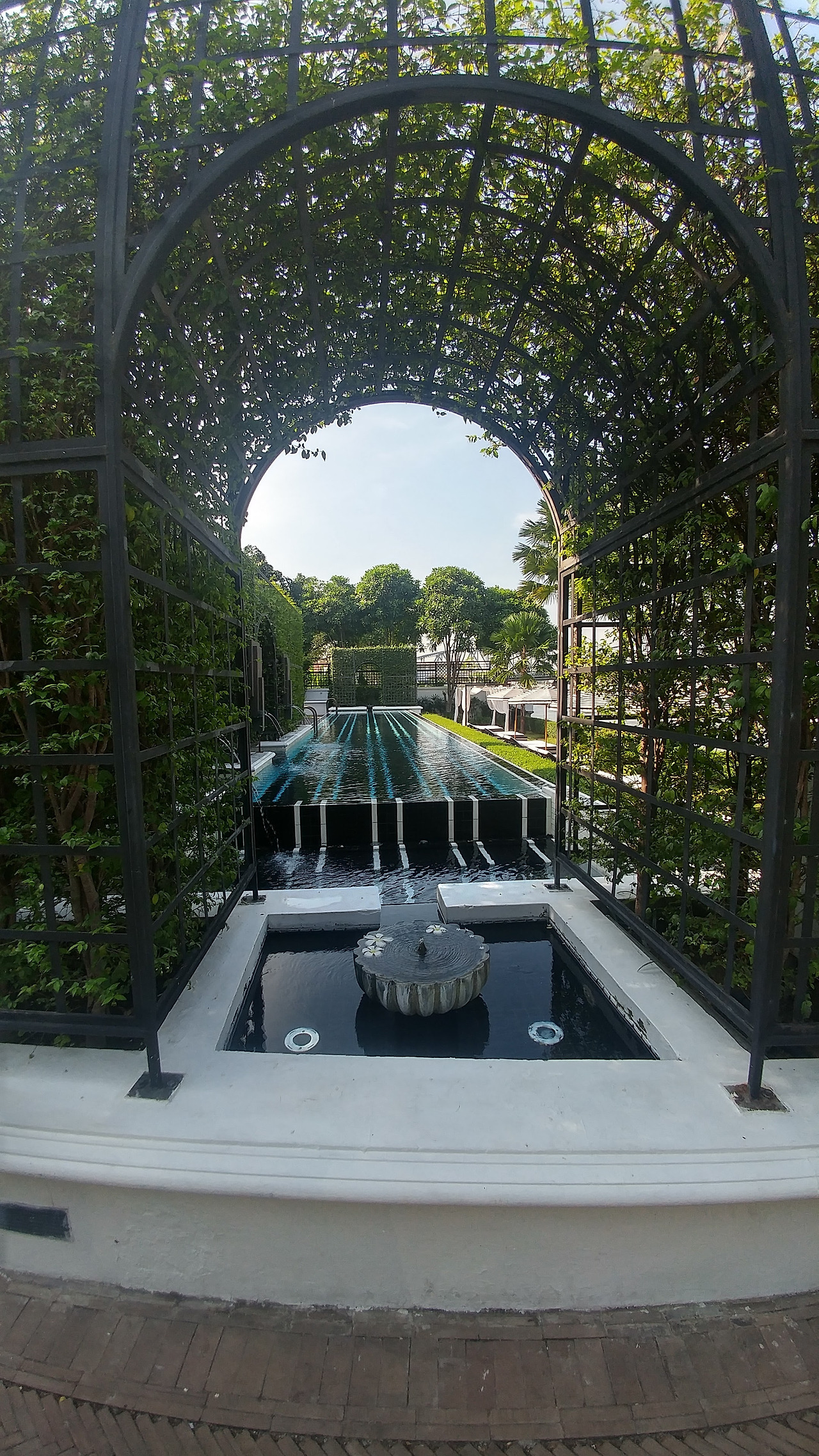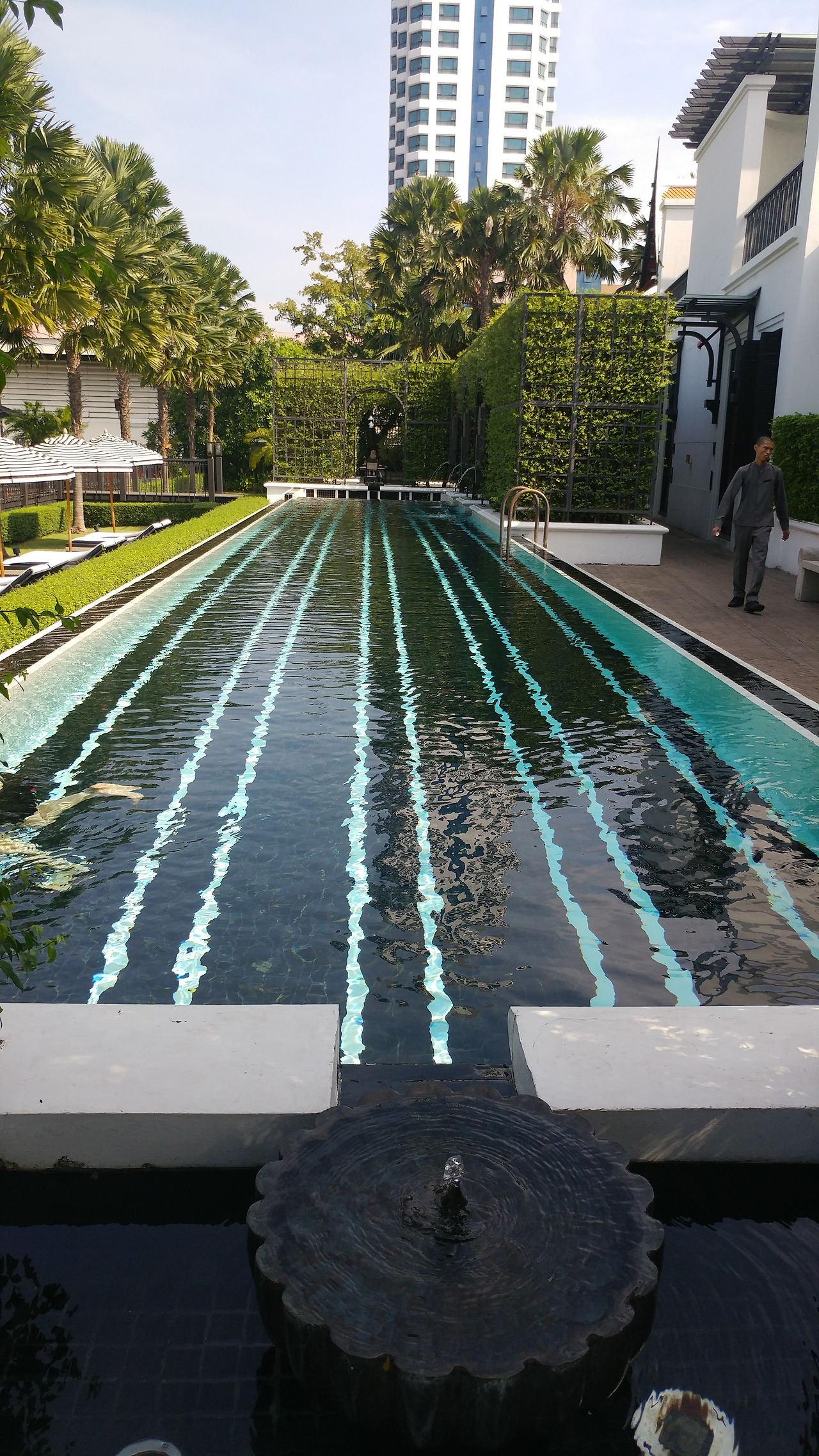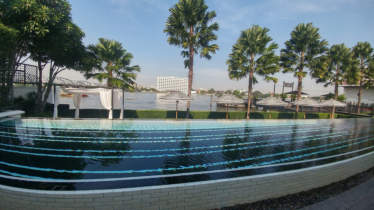 짜오프라야강을 바라보며 바로 앞에 있는 수영장이다. 크진 않고 보이는 게 전부일 정도지만 수영을 즐기기엔 무리가 없다. 자리에 착석하면 바로 센스 넘치는 직원이 부채, 선크림과 모기퇴치제, 생수 그리고 수건이 든 나무 바구니를 가져다준다. 행사를 많이 해본 나로서는 이러한 센스에 한번 더 반하게 된다. 작은 경험이 그곳에 대한 이미지와 브랜딩에 크나큰 효과를 발휘하기 때문이다.