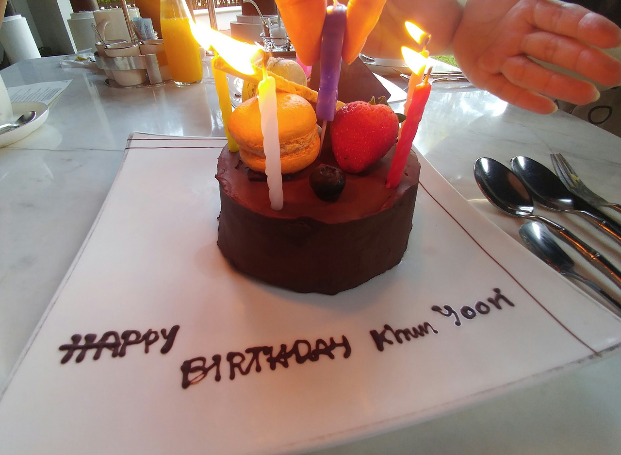 맞다! 내 생일이었지? 호텔에서 달달한 마카롱이 올려진 초콜릿 케이크를 선사했다. Khun, 쿤(คุณ)은 '당신'을 뜻한다. 한국은 춥디 추운 겨울철인데 따뜻한 나라로 가서 보내는 뜻깊은 생일이었다.