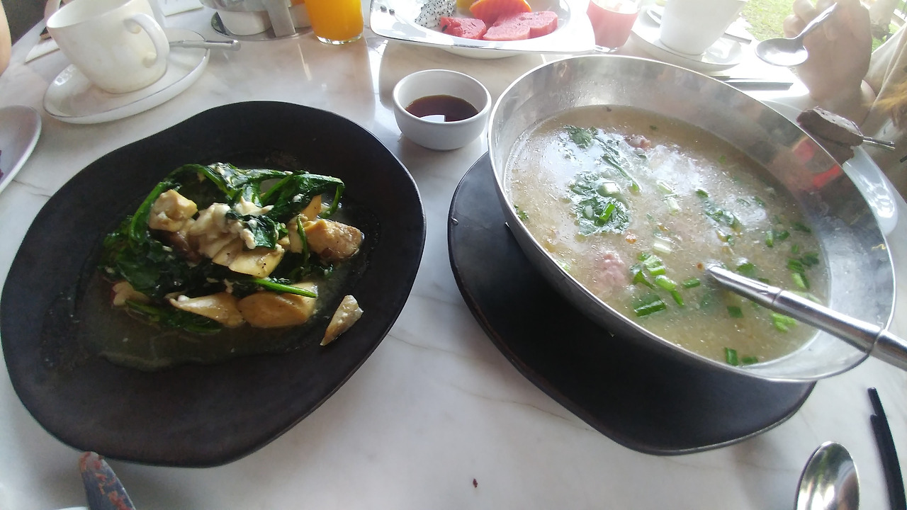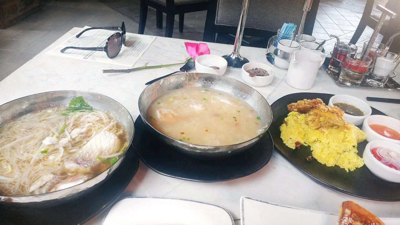 조식도 먹어본 놈이 안다고 과일과 와플 오믈렛으로 시작했다. 그리고 난 다음은 우리에게 환상적인 국물 맛을 알게 해 준 설렁탕 같은 국으로 이열치열을 제대로 느꼈다. 태국 음식은 다 맛있지만 얇은 국수에 설렁탕 같은 국이 가장 기억에 남는다. 음식이 다 차려지면 꽃 한 송이도 놓치지 않고 전해준다. 이곳은 천국임에 틀림없다.