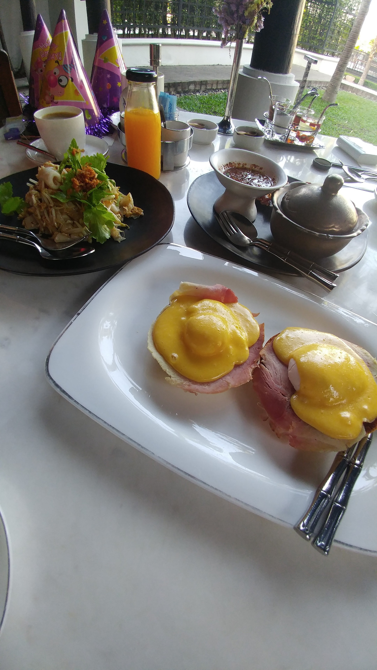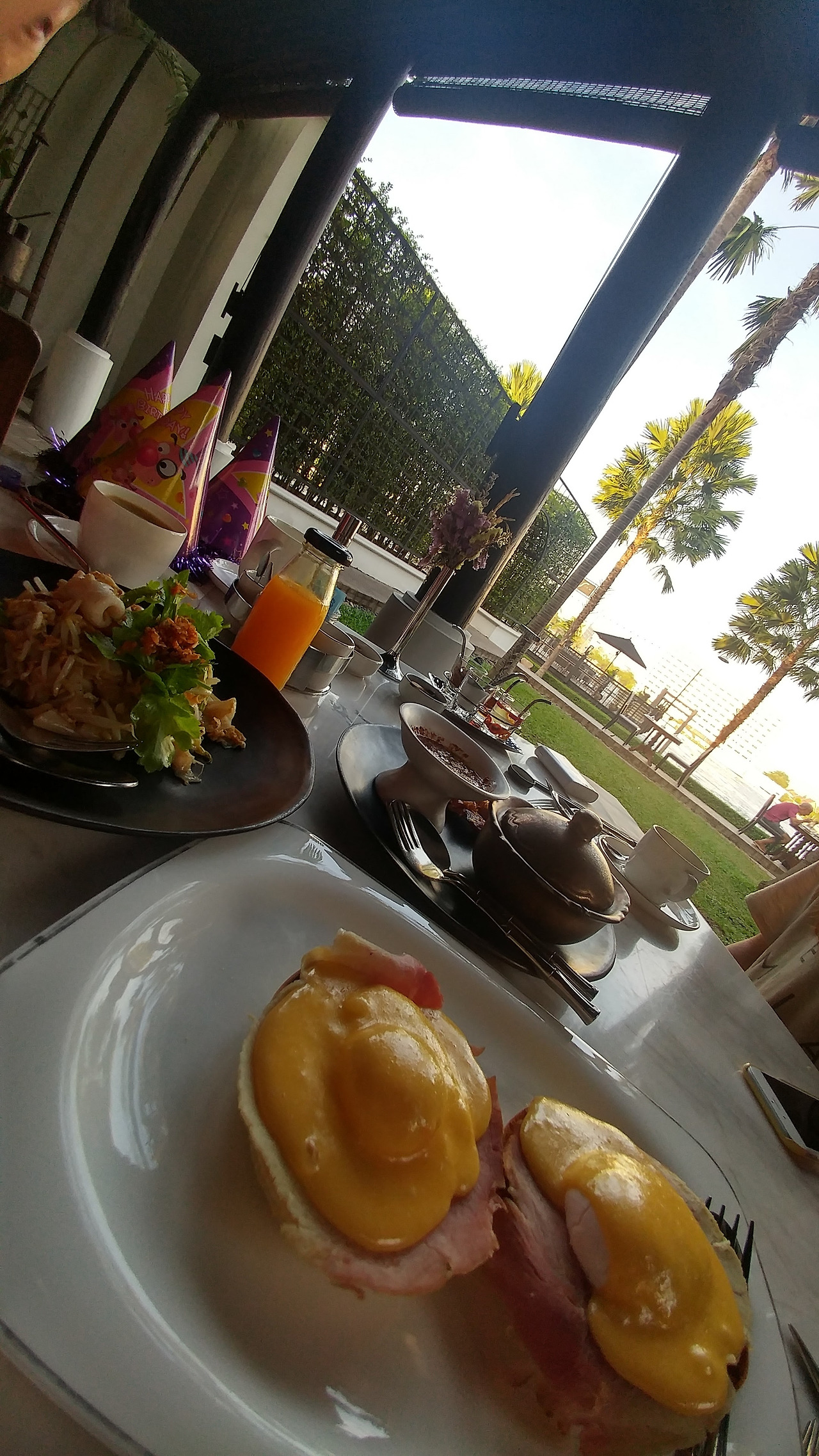 조식 식당인 Chon Thai는 짜오프라야 강을 보며 맘껏 즐길 수 있다. 수영장을 지나 짜오프라야 강변을 따라 걸으면 바로 조식당으로 연결된다. 동남아 답게 엄청나게 싱싱한 과일들이 가득하다. 조식은 뷔페식이 아니라 메뉴가 여러 가지지만 모두 주문이 가능하다. 좋아하는 타이 음식은 물론 컨티넨탈 브렉퍼스트 형태로도 주문이 가능했다. 에그 베네딕트와 파타이 그리고 꼬치를 주문하니 예쁜 그릇에 담겨 나왔다.