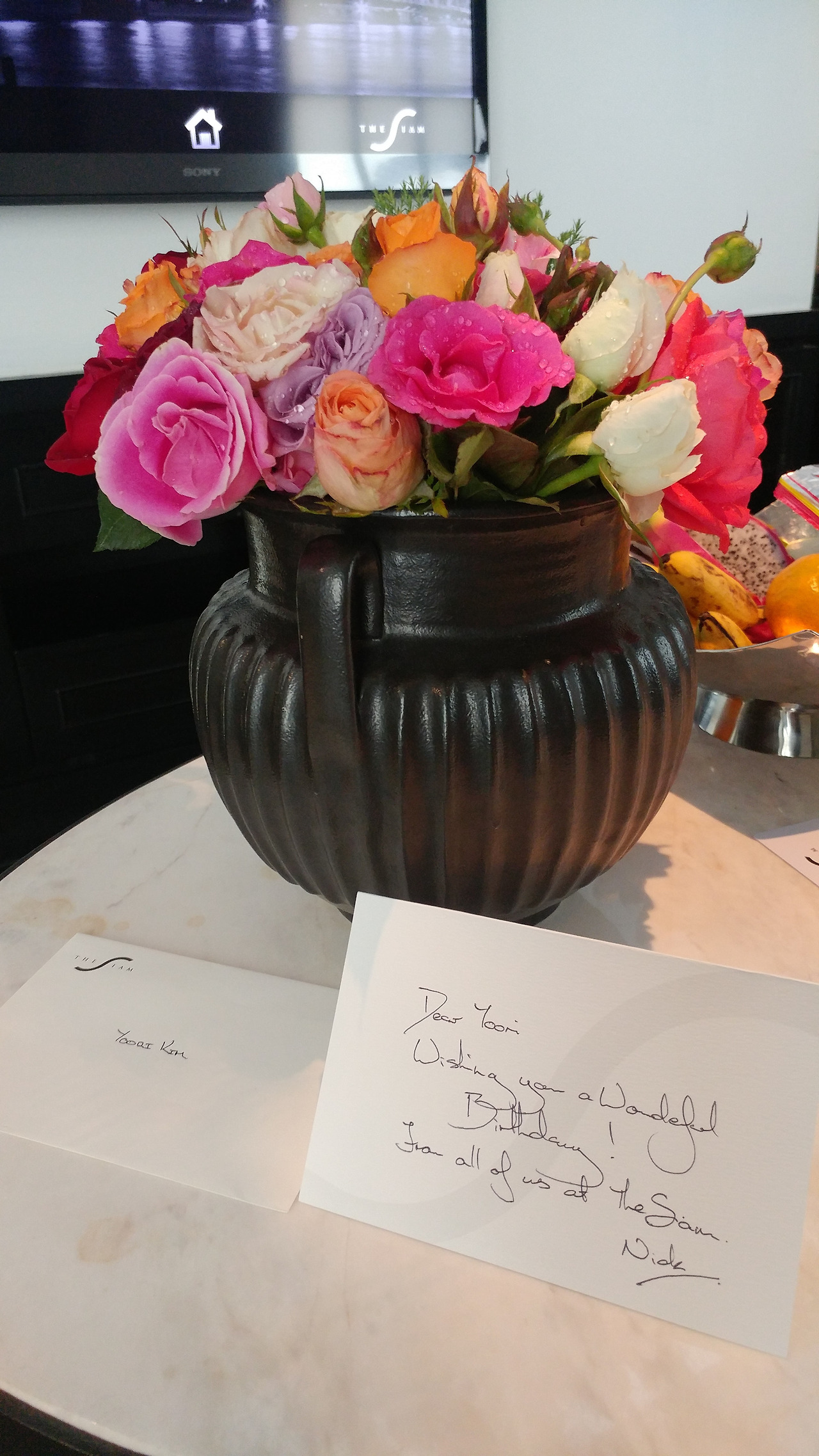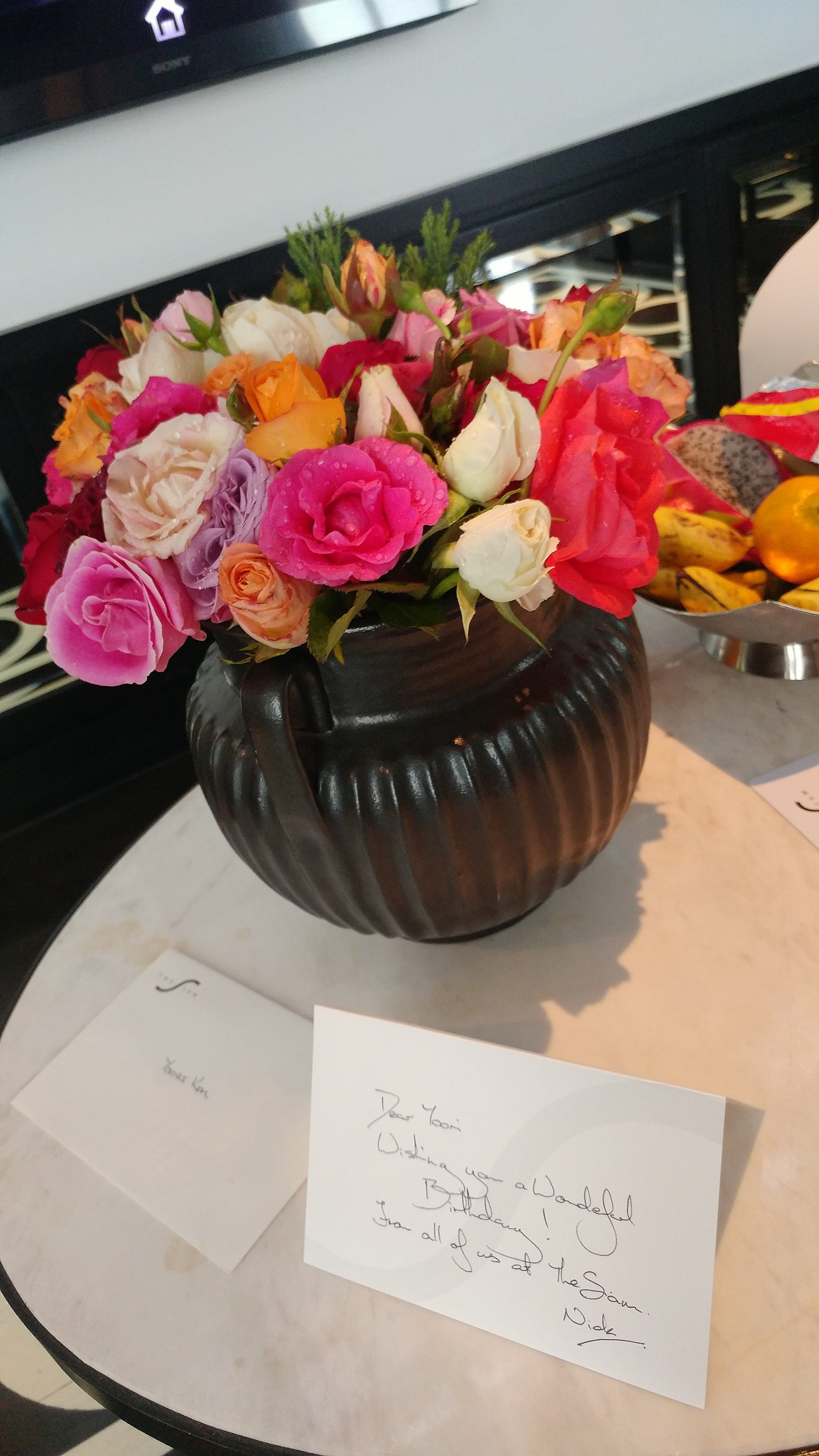 호텔을 구경하고 방으로 돌아왔는데 생일 축하 꽃과 카드 그리고 예쁜 해피버스데이 장식이 가득했다. 아침에 조식당에서 생일파티를 하던 우리를 총지배인이 본 모양이다. 꽃 하나하나가 너무나 예쁘고 향기로웠으며 내 생일을 더 시암 호텔 모두가 축하한다고 써놓으니 기분이 날아갈 것만 같았다. 평생 잊지 못할 생일이다.