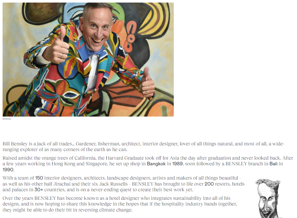 복도에는 전시품들이 가득해서 보는 재미도 가득하다 마사지 샵에서 제공되는 호사! 끝까지 감동이다. 행복한 생일의 기억을 남겨준 버틀러 Sumet, 총지배인 Nick과 함께 이 호텔은 세계적인 건축가 빌 벤슬리(Bill Bensley)의 작품이다. 60대의 나이임에도 불구하고 멜빵바지와 원색 옷을 좋아하며 신나게 폴짝 뛰는 모습을 가진 천진난만한 모습이 기억에 남는다. 이 호텔을 방문한 이후에 블랙 앤 화이트의 매력에 푹 빠져버렸다. 나중에 내 집을 블랙 앤 화이트로 제대로 꾸며봐야겠다. 감각적인 그의 작품은 그의 홈페이지에서 확인할 수 있다. 그의 호텔은 너무나도 감각적이며 그는 투숙객을 환상에 젖게하는 공간을 창조해낸다.