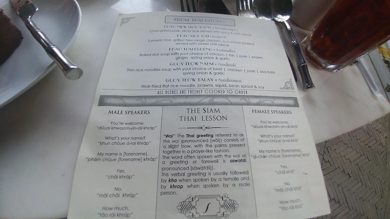 우리의 먹보 행진은 계속되었다. 주문한 음식 중에 아래 설렁탕 같은 탕 종류가 가장 맛있었다고 다들 미리 주문하지 못한 걸 아쉬워했다. 이걸 젤 먼저 시킬걸! 역시 이런데 와서 남들 먹는 것보다 다른 거 시키는 나의 저돌적인 습성이 성공할 때가 있다. 메뉴판 아래쪽에는 잠시나마 태국어를 익힐 수 있는 시간이 있어서 태국을 알리고자 노력하는 호텔 측의 세심한 배려가 느껴졌다.