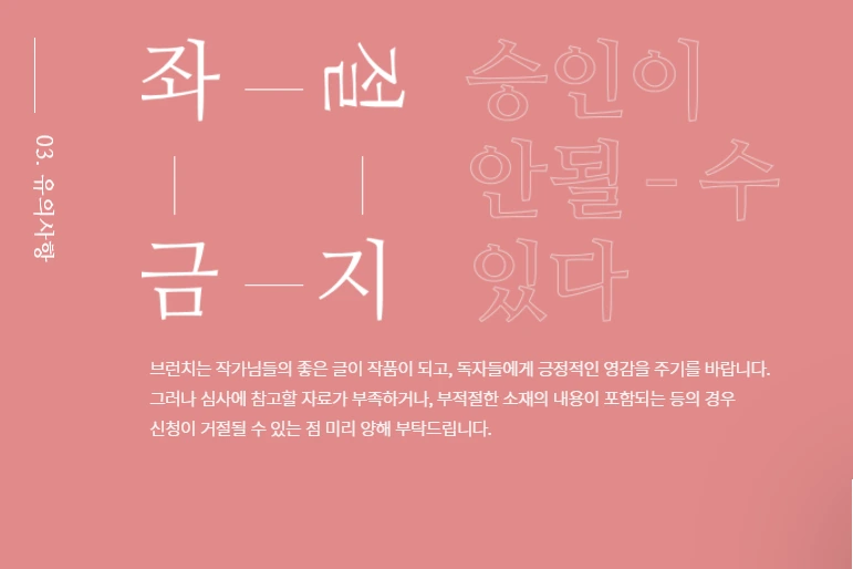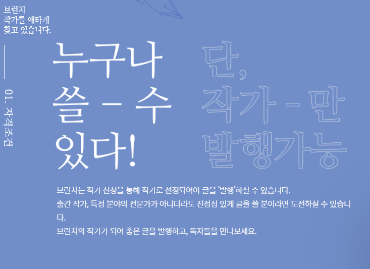 브런치는 프로를 찾는 게 아니다. 당신이 아마추어임을 알고 있다. 그러나 글을 쓰고 싶고, 또 일상에 대한 성찰 내용을 풀어놓길 원한다. 만약 취준생이라면 '연이은 광탈로 좌절→취업스터디 가입→피드백으로 인한 내 장단점 파악→공감대 형성과 자신감 극복' 이렇게 개인의 경험을 공유하길 원한다. 물론 승인이 안될 수도 있다. 하지만 브런치가 원하는 점은 좋은 글이 작품이 되고, 또 독자들에게 긍정적인 영감을 주는 선한 영향력을 바라는 것이지 이미 원고료를 받고 기고문이나 칼럼, 매거진을 쓰는 프로페셔널이 아니다. 당신이 부딪친 고난을 어떻게 극복했나? 해결과정에서 다른 이에게 어떻게 공감을 줄 것인가?를 보는 듯하다. 아마추어여도 꾸준히 좋은 글을 발행할 의지가 보이면 승인될 수 있다.