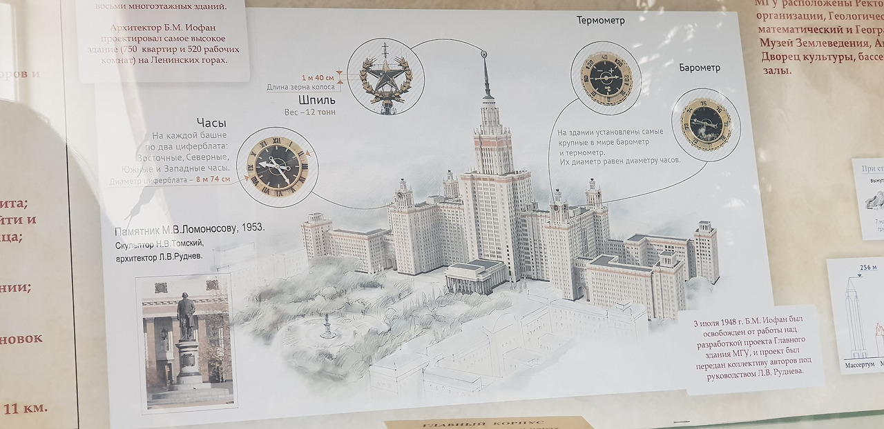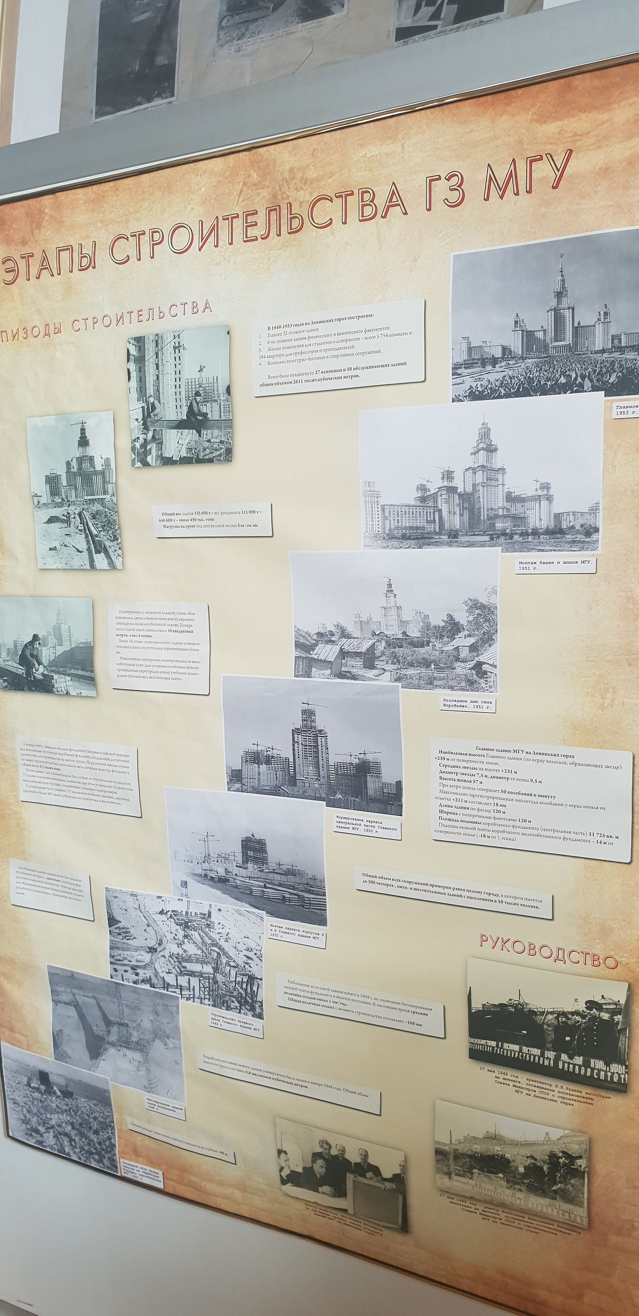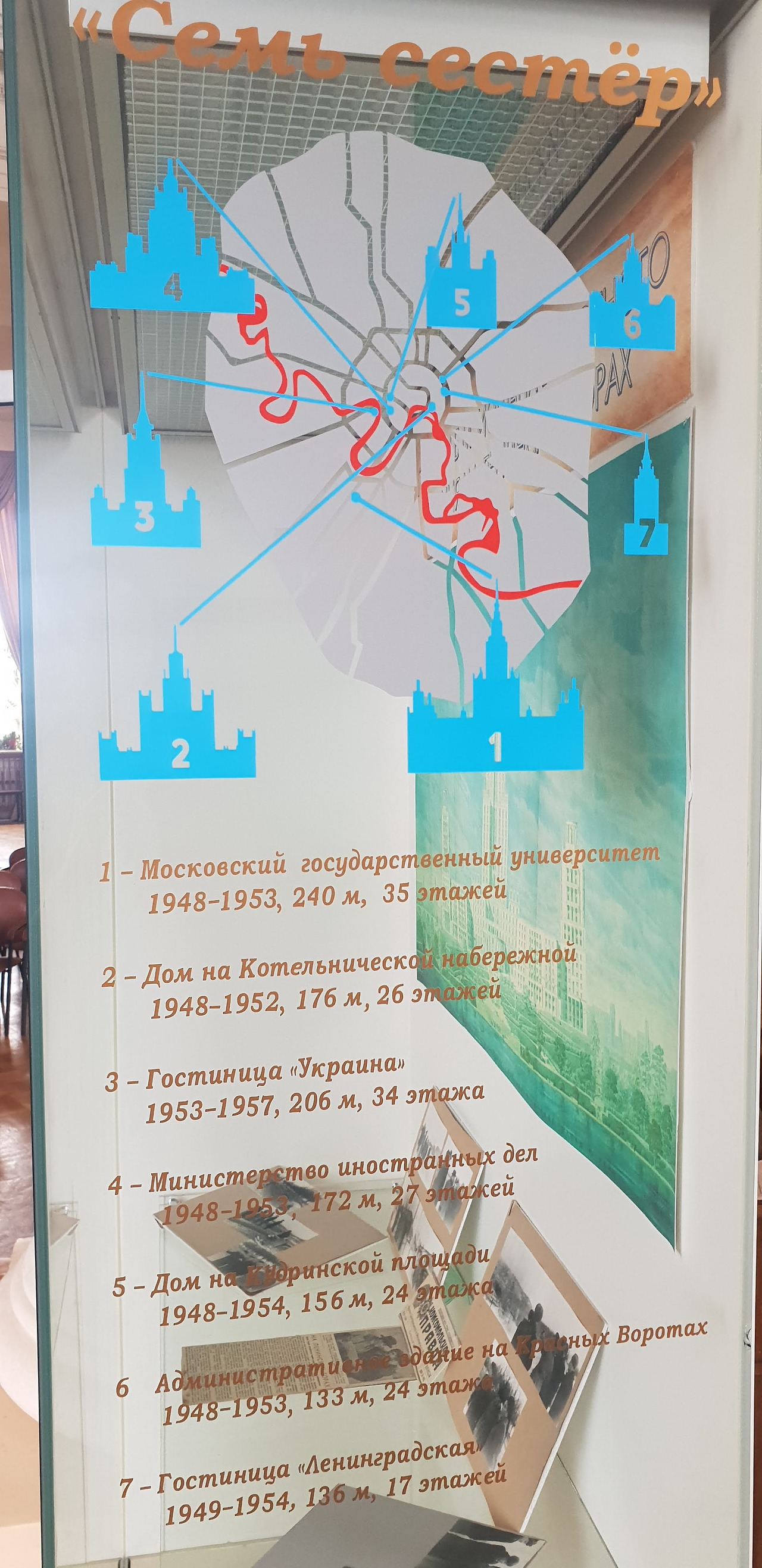러시아 최고층 건물 중 하나답게 박물관 및 전망대에 들어서나 모스크바 전역이 다 보이는 듯하다. 해발 114m의 작은 언덕인 참새 언덕도 보인다. 아래에서 느낄 수 없었던 위치를 전망대에서 제대로 느낄 수 있다. 세븐 시스터즈의 설립 과정부터 우주항공에 까지 자부심이 넘친다. 러시아는 지리적으로 엄청나게 큰 영토다. 두 지점 간의 가장 먼 거리는 7,900km가 넘는다. 국토가 넓은 관계로 도로 수송보다 항공, 철도 수송에 의존한다. 군 전력 강화의 일환으로 항공산업을 적극적으로 육성해 왔고 미그, 수호이 등 고등 전투기를 설계할 만큼 뛰어난 항공산업을 갖추고 있다.