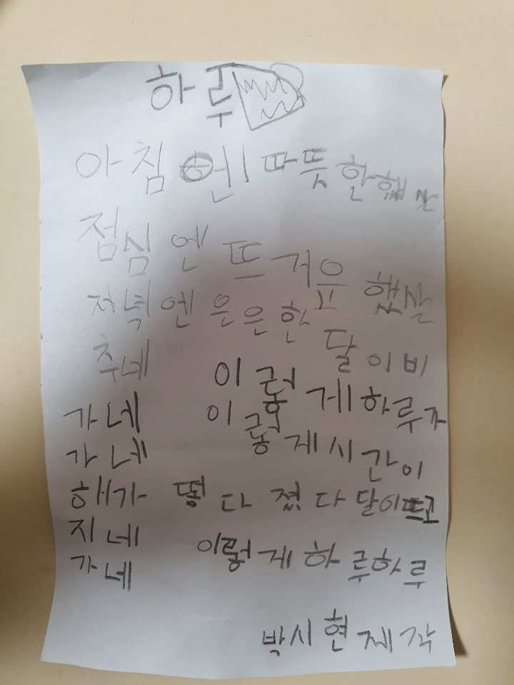 아침에는 따뜻한 햇살이 눈부시게 잠을 깨우고 점심에는 뜨거운 햇살이 창을 통해 들어옴을 느끼고 쓴 시 <하루>다. 해가 지고 나면 저녁에는 은은한 달이 깜깜한 저녁 하늘을 비춘다. 그렇게 하루가 지나가고 해와 달을 집안 창문에서 바라보며 하루가 지나가는 아쉬움을 가득 담은 시다. 뛰어놀지 못하는 하루가 지나가는 게 서운해 시간이 흘러감에 따라 애틋한 그 마음을 고이 담아 시로 표현했다. 해가 뜨고 지고 또 달이 뜨고 지는 하루를 온전히 바라보고 쓴 조카의 시각이 감동을 준다.