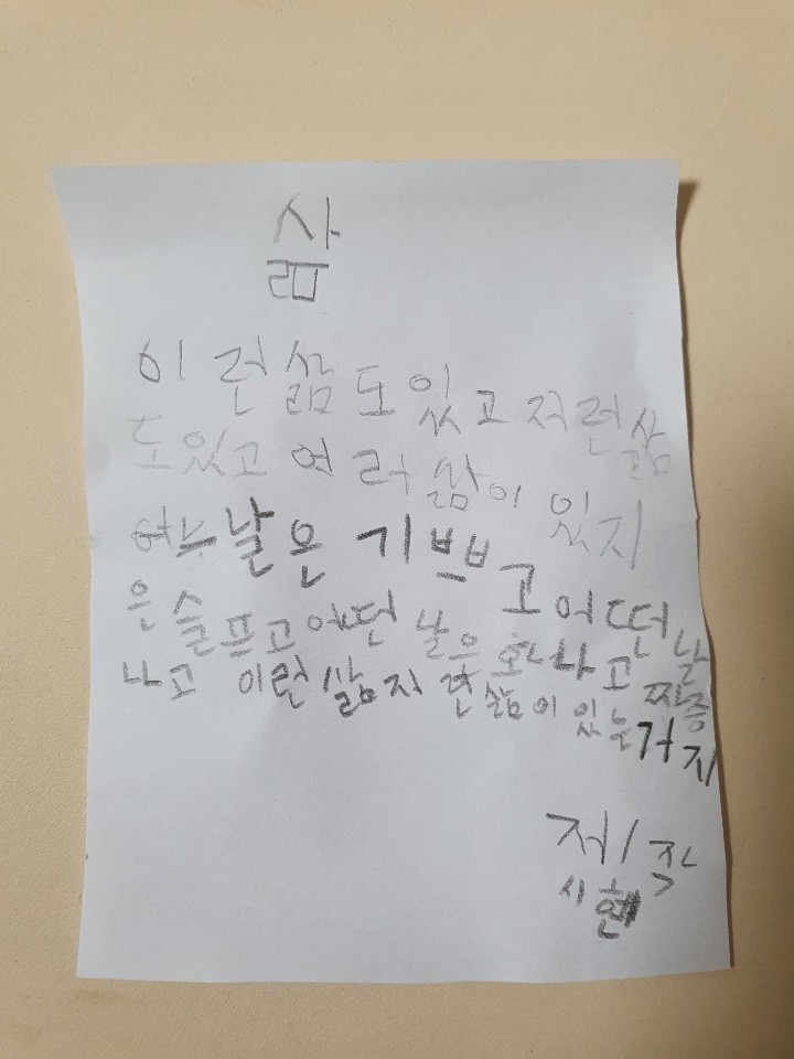 시를 썼다길래 귀여운 글씨체를 볼 겸 들여다봤는데 보통이 아니다. 적어도 인생 2회 차를 사는 것 같다. 코로나19가 그녀에게 이런 시련을 남겼나? 안타깝기도 하고 어른들에게 초등학생 어린이에 불과하지만 자기가 겪은 세상의 전부에서 느낀 바를 압축한 시로 담아낸 게 놀라울 따름이다. 아직 무늬만 어른인 사람도 깨닫지 못한걸 8년의 인생에 알아차리다니 기특하고 장하기만 하다.