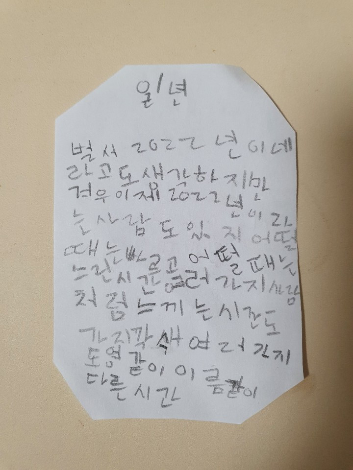 일 년에 대한 여덟 살의 시각이다. 시간 참 빠르다고 흐느끼는 게 어른의 일상인데 여덟 살의 눈에는 시간을 다르게 받아들이는 어른들이 이렇게 보이나 보다. 한 명 한 명마다 다르게 체감하는 시간을 일 년에 비유했다. 어떤 이에게 주어진 시간이 빨리 흘러간다 말하지만 어떤 이에게는 지루하고 느리게만 흐른다 말하는 걸 본 모양이다. 이는 우리 모두가 각자 다른 도형과 같이 다른 사람이기 때문이라 말한다. 그러기에 느끼는 시간의 개념도 다 다른 것이다. 다르게 생긴 도형과 같이 주어진 각자의 이름과 같이 시간도 같게 흐르지 않는다.