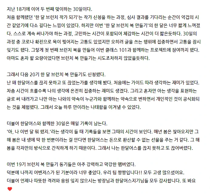 한달어스 멤버로 시작해 서포터즈 이후 방장을 맡게 되었다. 글쓰기 프로그램으로 <한달글쓰기유치원>,<한달브런치작가되기>,<한달브런치북만들기> 세 개를 맡고 있다. 18기에 이은 19기는 코로나 확진자들이 많아 염려했지만 오히려 아픔을 글로 승화하시는 분들이 많아 더더욱 놀랐다. 놀라운 글쓰기의 힘이다.