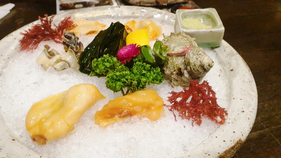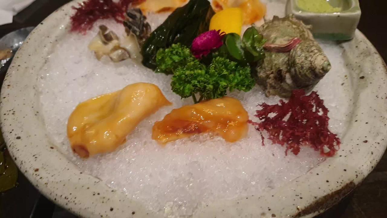 그다음 나온 건 멍게였어요. 미역에 싸 먹을 수 있도록 나와 있고요, 평소에 멍게는 더 노란색으로 기억하는데 여기는 크기도 더 크고 맛도 있더라고요. 레몬을 솔솔 뿌리고 생고추냉이를 간장에 넣어 먹으면 꿀맛이랍니다.
