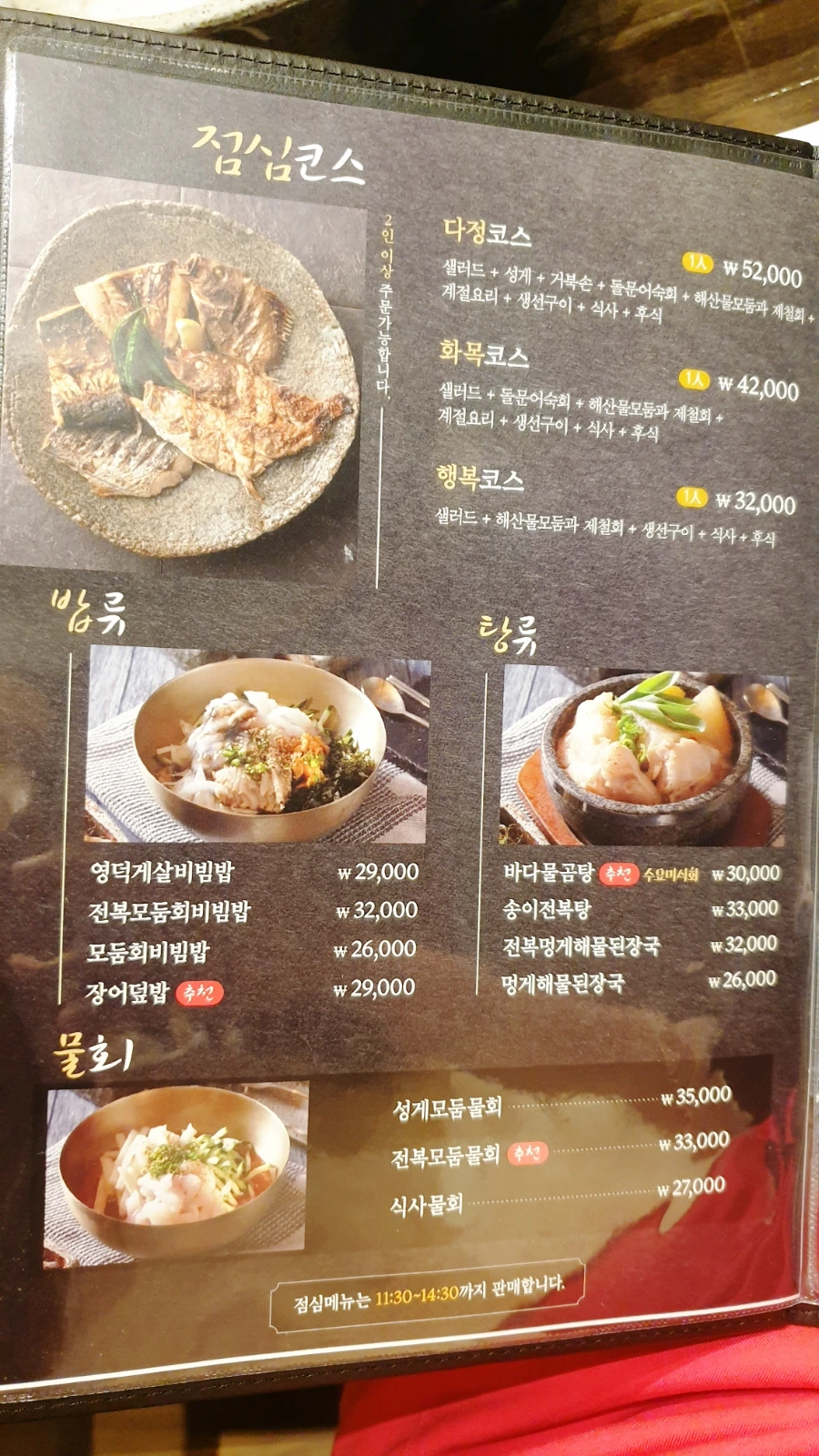 민어철이라 민어탕이 인기가 많더라고요. 저희는 점심 코스 중 '행복 코스'를 먹었답니다. 샐러드와 함께 해산물 모둠과 제철 회 그리고 생선구이가 나와요. 해산물 모둠과 생선구이 밥이 함께 나오다니 코스요리가 너무 기대되었어요!