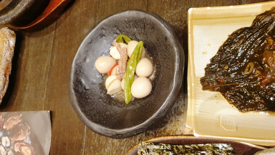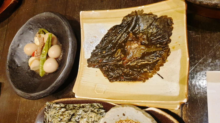 밥과 함께 먹으면 좋은 김과 간장도 나오고요. 깻잎은 반으로 잘라주셨으면 더 좋을 것 같아요. 메추리알과 마늘 그리고 꽈리고추도 별미입니다.