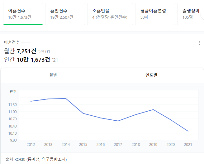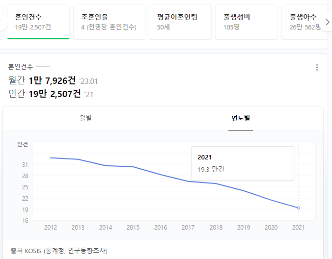 통계청 인구동향조사에 따르면, 2023년 1월 혼인건수는 1만 7,926건이나 이혼건수는 월간 7,251건이다. 2021년 연간 혼인건수가 19만 2,507건이었지만, 이혼건수는 절반정도인 10만 1,673건이다. 2012년 연간 혼인건수는 32.7만 건이었으나, 2021년엔 19.3만 건으로 금갑 했다.