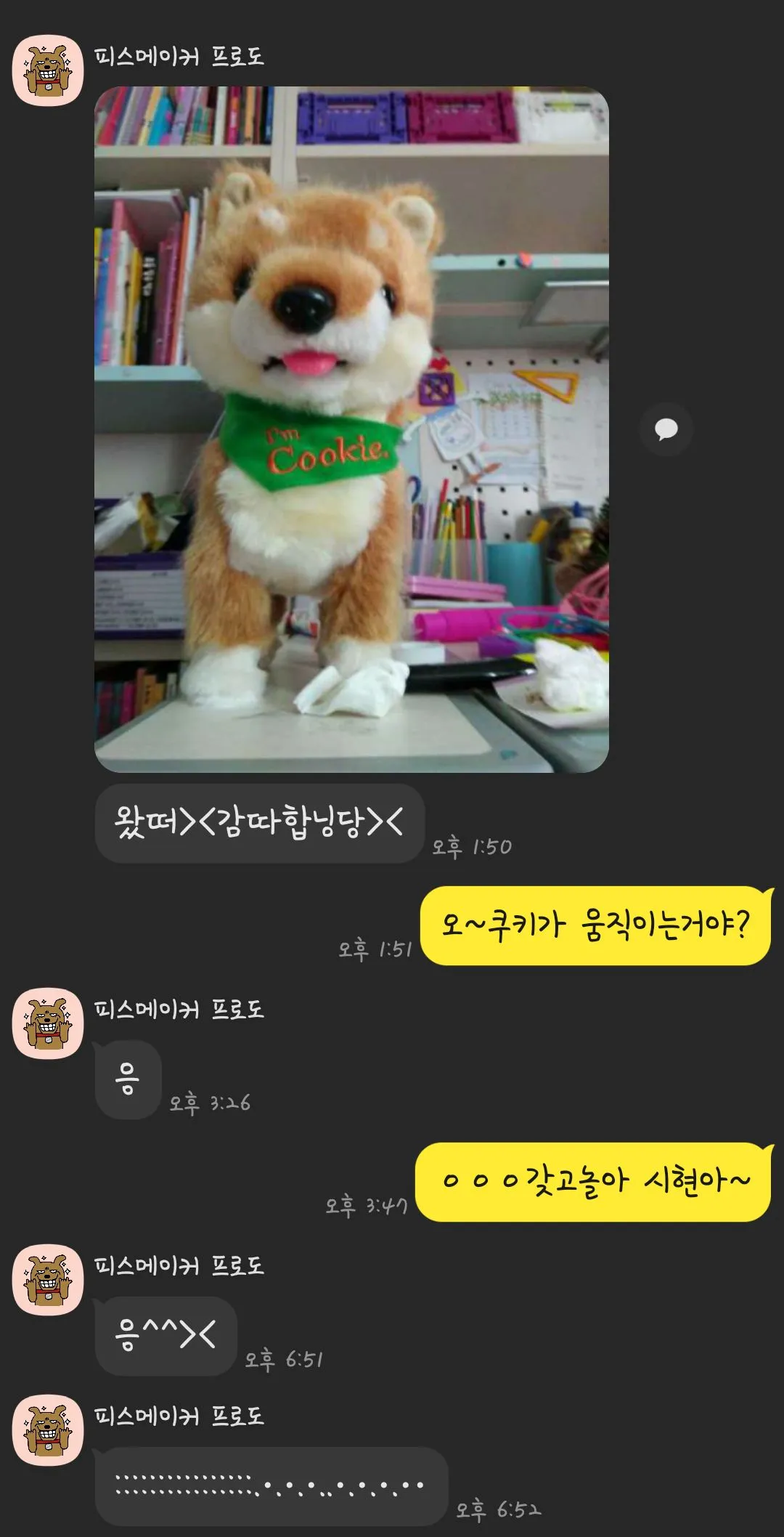 나: "응, 이모 산책하고 있어. 시현이는?"