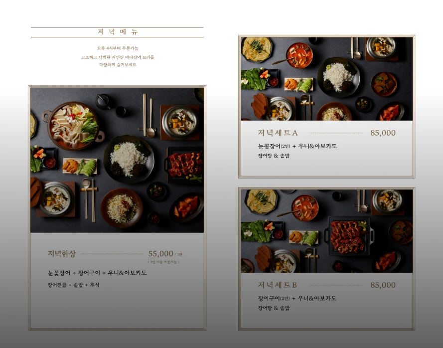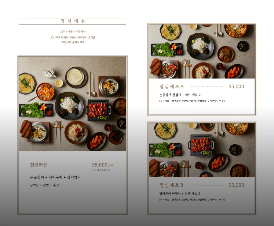 점심한상: 눈꽃장어+장어구이+장어쌈피+장어탕+솥밥+후식 35,000원