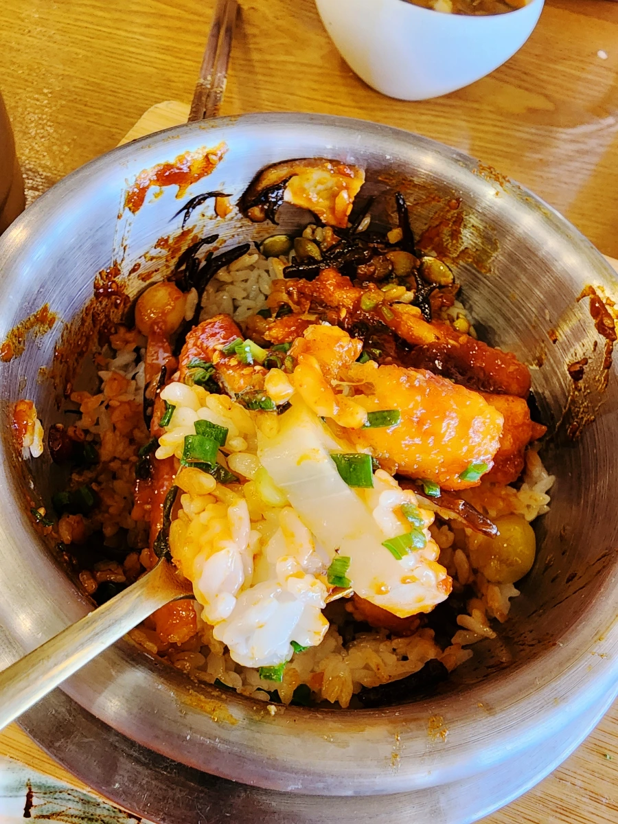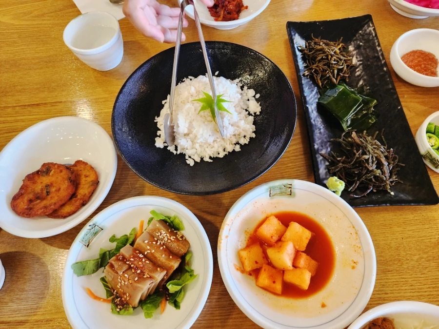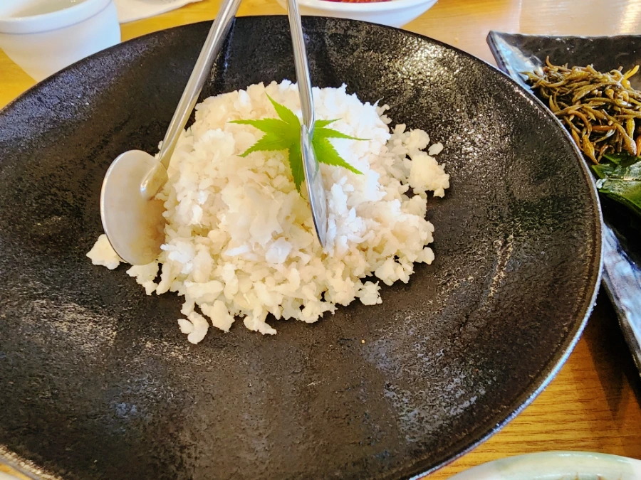 점심한상 중 눈꽃장어와 미숫가루와 간장이 잘 버무러진 야채가 먼저나왔어요. 눈꽃장어가 뭔지 궁금했는데장어 살을 잘 발라놓은 겁니다. 쥬얼도 넘나 예쁘죠?