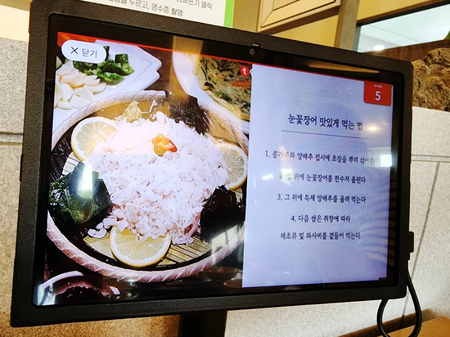 자리에 앉자 마자 티오더로 주문하면 되고요. 눈꽃장어 전문점이라 했는데 어떤 곳인지 궁금했거든요. 장어를 잘게 눈꽃처럼 썰어 놓고 또 미역과 톹을 함께 먹는게 바로 눈꽃장어예요.