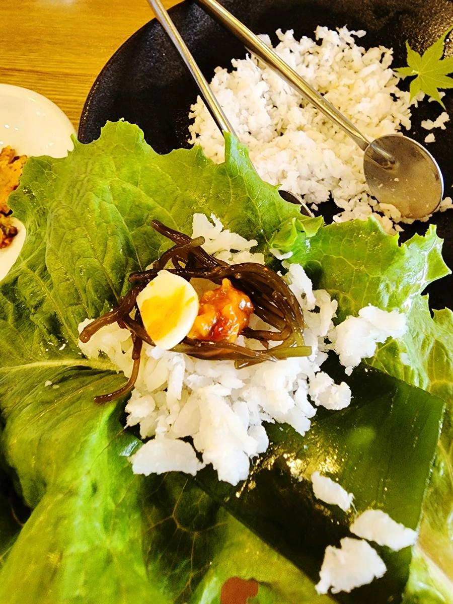 상추와 깻잎이 따로 나오고 거기 위에 미역, 톹을 얹은다음 눈꽃장어를 얹으면 꿀맛입니다. 바다의 맛을 한금 먹음은거 같아요! 남녀노소 좋아할거 같은 별미에요.