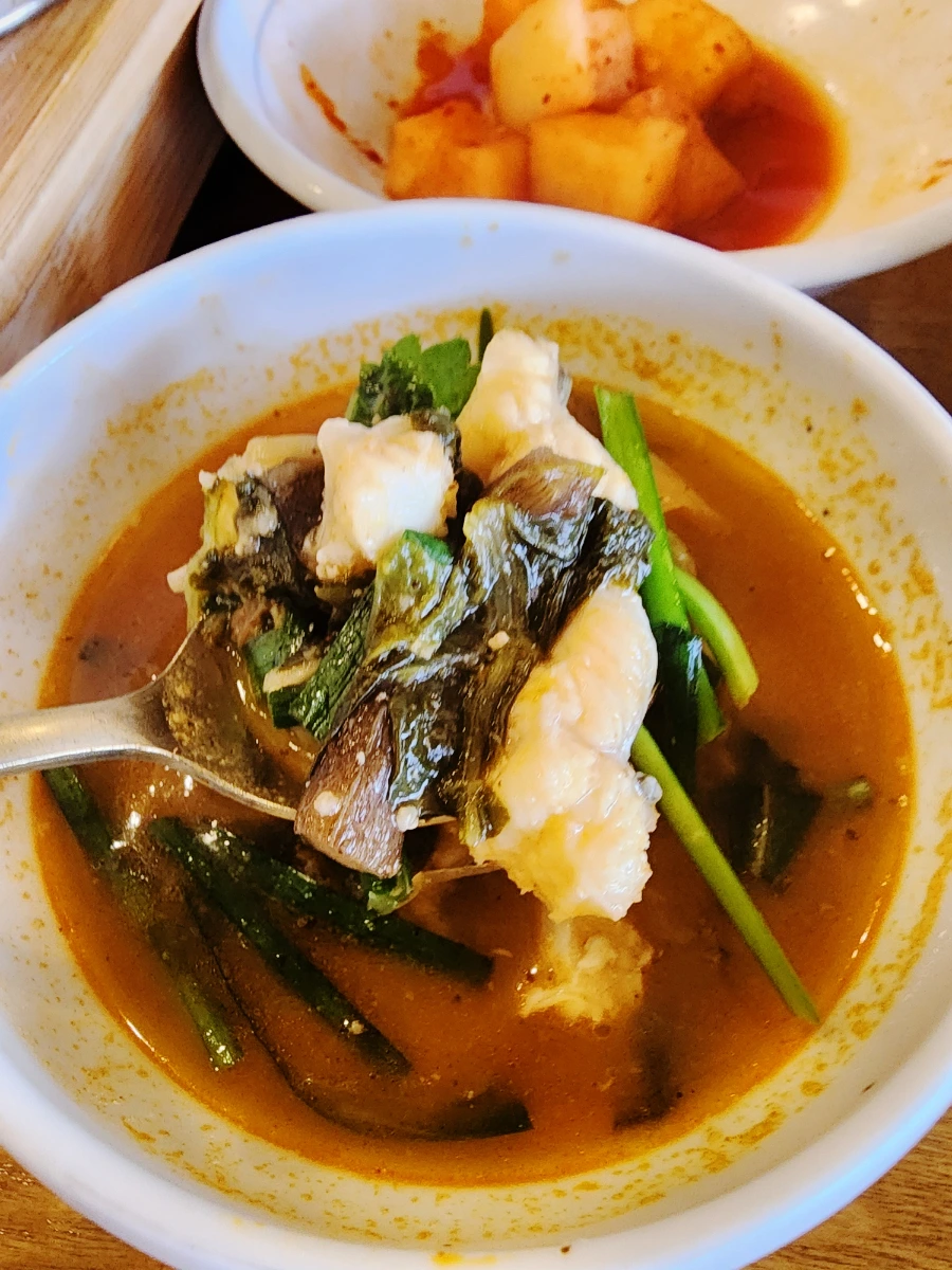 가장 추천하는 건 바로 이 장어탕입니다. 와! 여름에 원기회복이 필요했는데 이제 추어탕보다 장어탕을 먹어야겠더라고요. 국물도 시원하고 너무 진하지 않아 좋고요. 장어 실한거 보이시나요? 각종 야채와 미나리까지 들어가서 밥도둑이더라고요! 이제 간장게장이 밥도둑 아니고 장어탕이 밥도둑이에요.