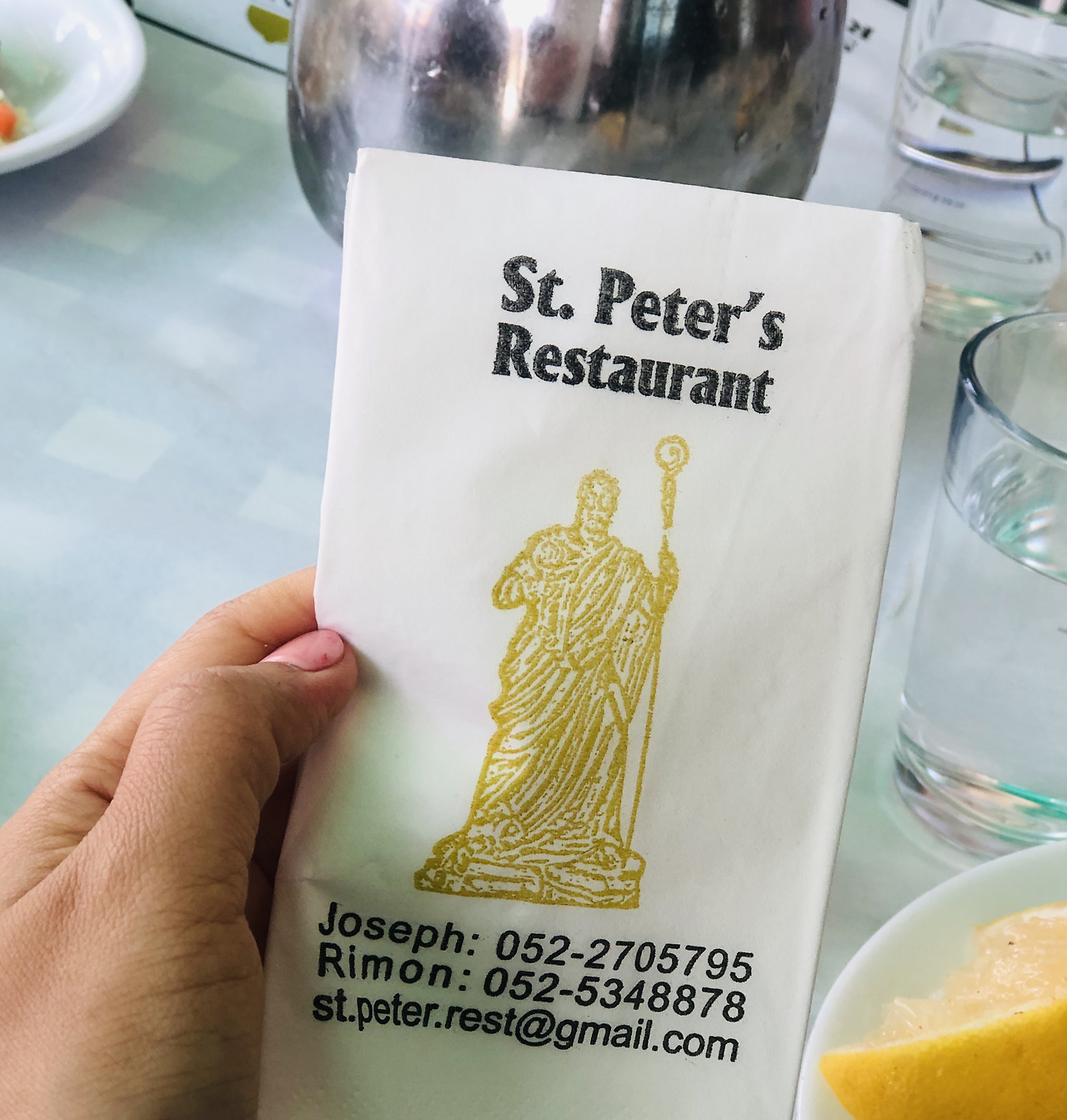 갈릴래아 호수 근처엔 베드로 식당이 있고, 메뉴에 ’베드로 물고기’가 있는데, 보기보다 직접 먹어보면 물고기가 생각보다 꽤 맛있었다. (가게 냅킨에 전화번호까지 있으니 가실 분들은 참고하세요)