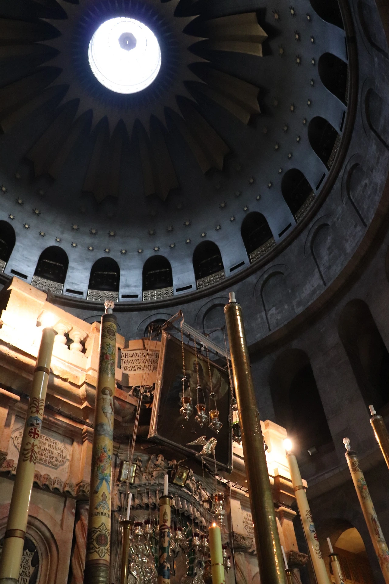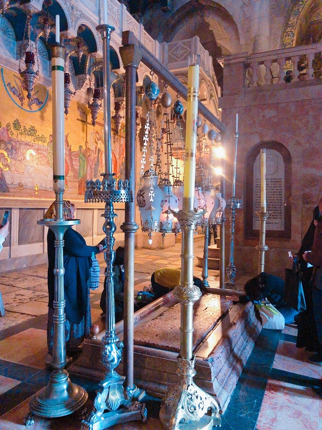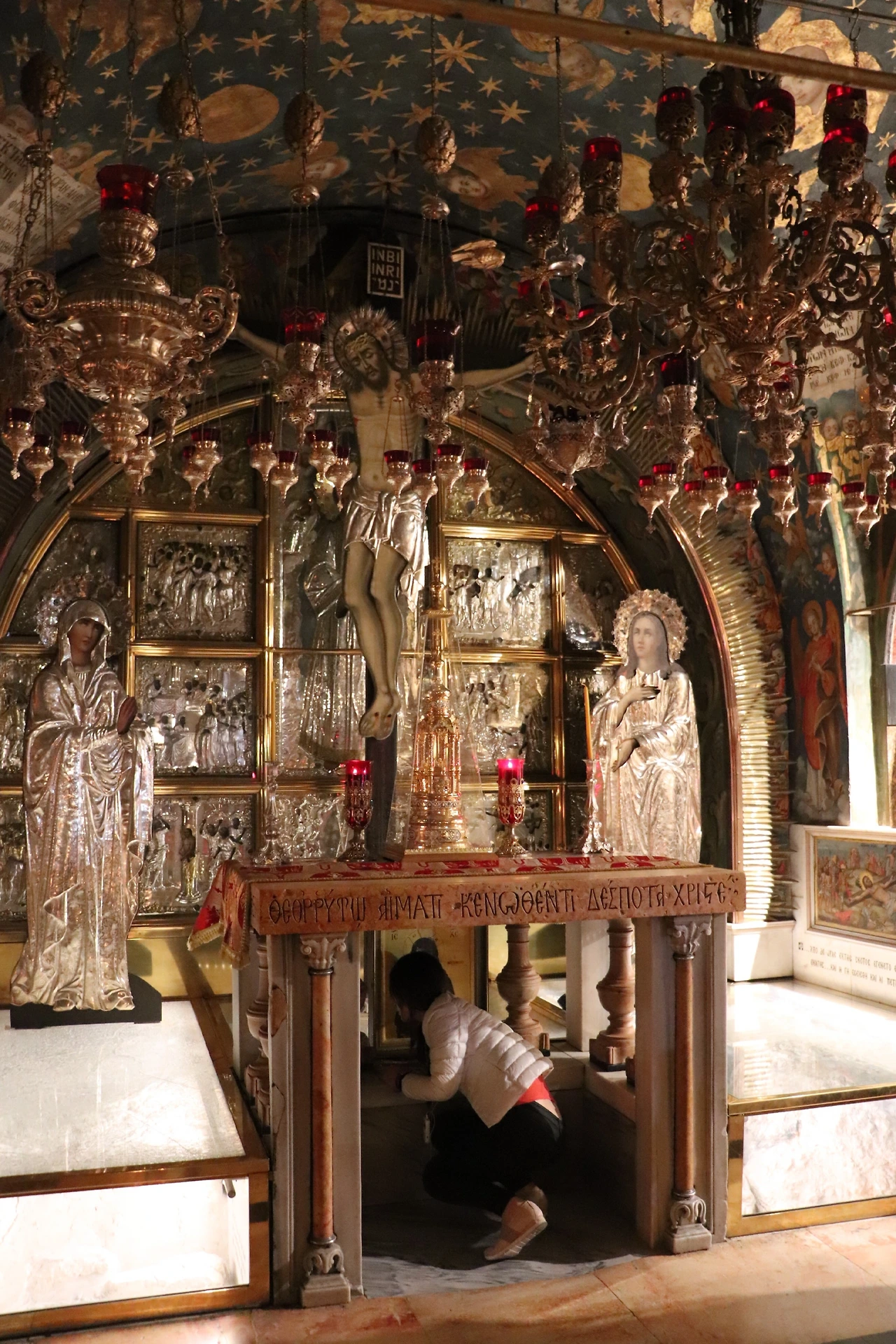 십자가 아래에 깊은 구멍이 있는데, 그곳에 예수님의 성혈이 떨어졌다고 한다. 그곳에 손을 넣어 눈을 감고 기도.