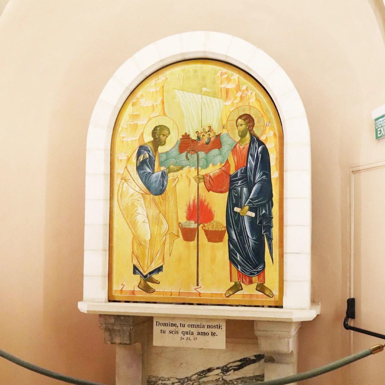 성당 안에 있는 두 개의 성화 비교가 흥미로웠다 다. 두 개 다 예수님과 베드로가 마주 보고 있는 상황인데, 하나는 예수님을 모른다고 부인하는 장면이다 보니, 베드로 머리에 윤광이 없고, 하나는 부활하신 예수님과 만나는 장면이니 베드로 성인 머리에 윤광이 있다.