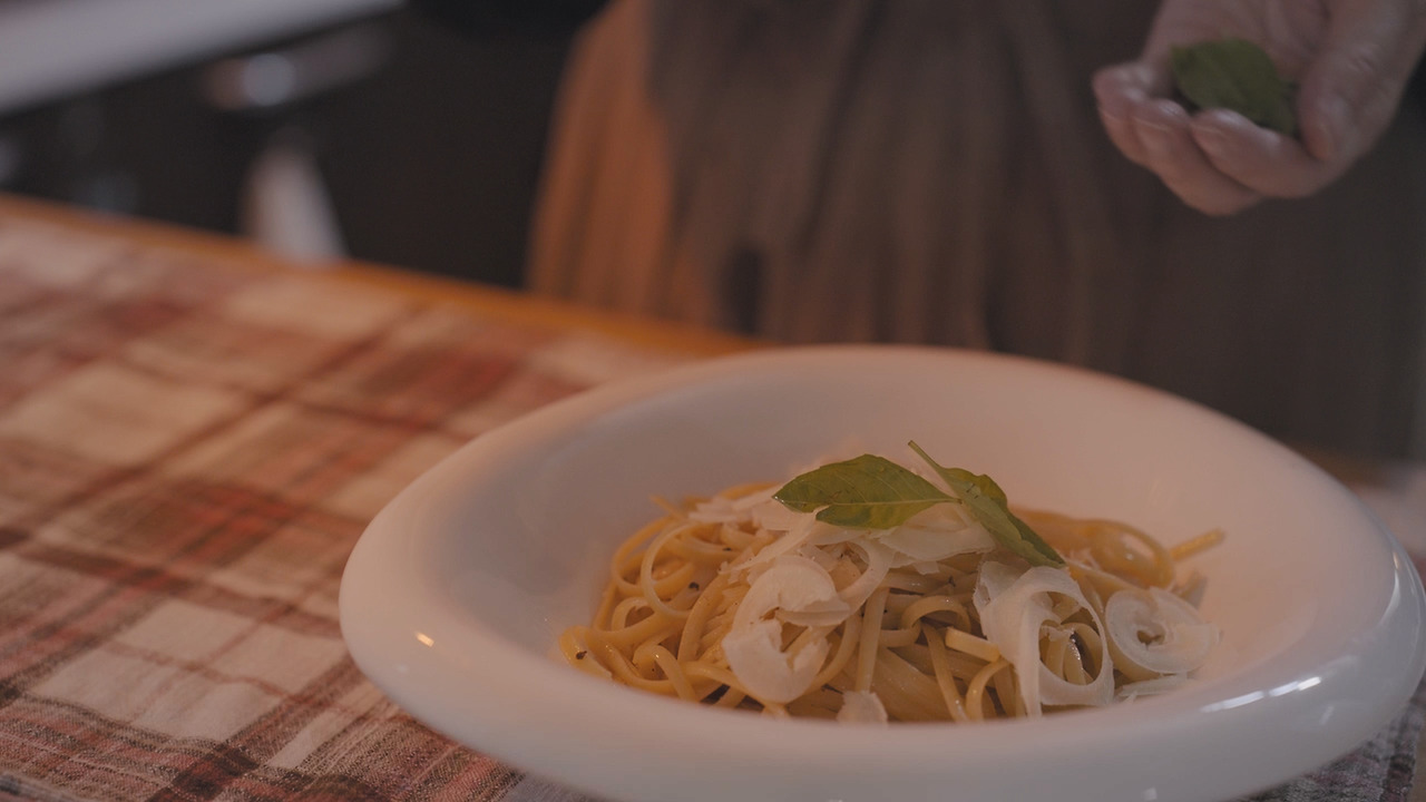 정성껏 기른 바질을 올려주면 꼬들꼬들한 알리오올리오 완성입니다