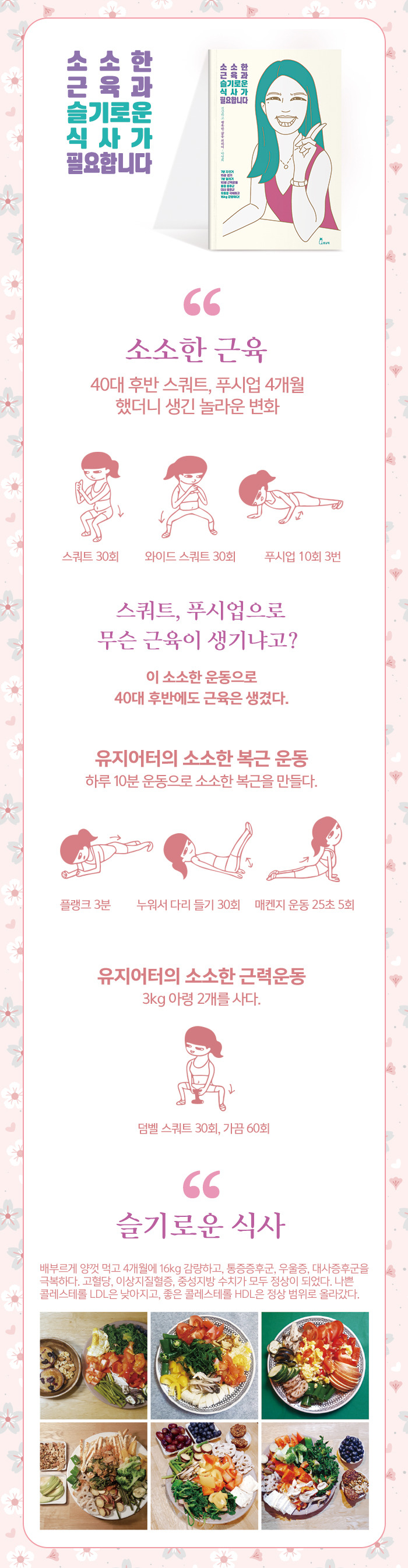 소소한 근육과 슬기로운 식사가 필요합니다 40대 후반에 슬기로운 다이어트 식사와 16시간 간헐적 단식을 병행하고, 스쿼트, 푸시업 4개월 했더니 생긴 놀라운 변화를 들려준다. 빡세게 운동하지 않아도 된다. 7분 자전거, 15분 걷기, 7분 달리기, 10분 근력운동, 이 소소한 운동이 일으키는 잔잔한 기적은 놀랍다. 통증증후군, 우울증, 대사증후군을 극복하고 4개월에 16킬로를 감량한 저자의 유쾌한...