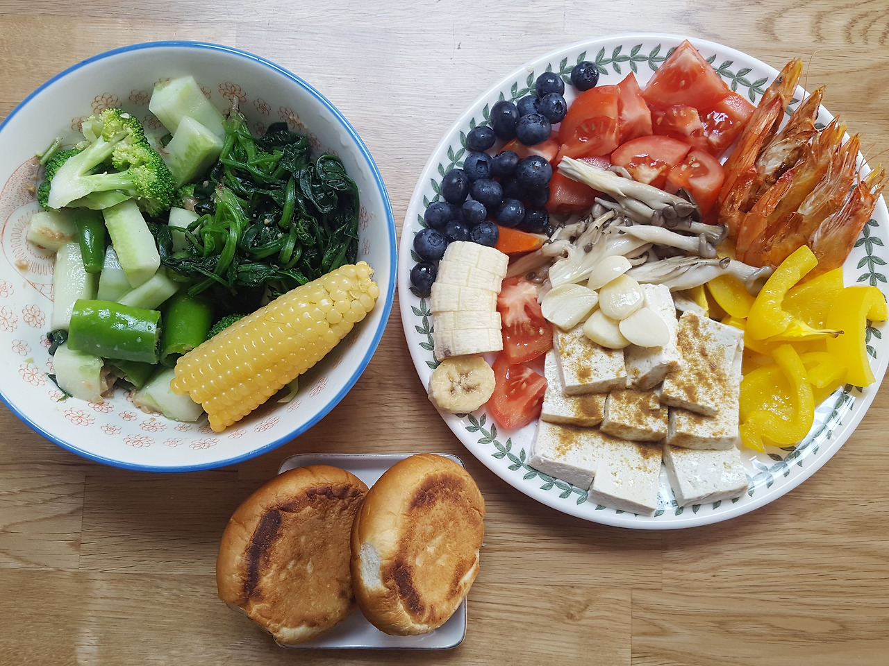 빵을 더 많이 먹을 때도 있고, 옥수수를 2개 삶아 먹을 때도 있습니다. 오늘은 새우 5마리도 에어프라이어로 구워 먹었어요. 빵을 많이 먹은 날은 달리기 10분 + 걷기 20분 정도 하고, 아령 운동을 10분 정도 더 하면서 유지하고 있어요.