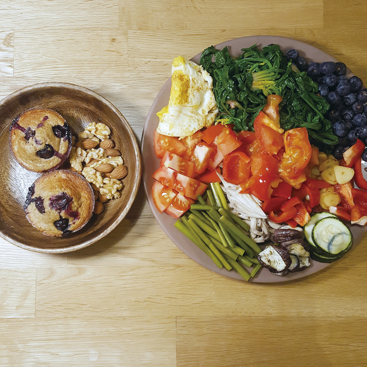위의 머핀은 오트밀을 믹서에 갈아 바나나를 으깨서 섞은 후에 시나몬 파우더, 소금, 올리브 오일을 조금 넣고, 블루베리를 살짝 뿌려 오븐에 200도로 15분간 구운 것입니다. 마늘쫑, 호박, 가지, 파프리카, 버섯도 올리브 오일과 소금을 넣고 오븐에 15분간 구웠어요.