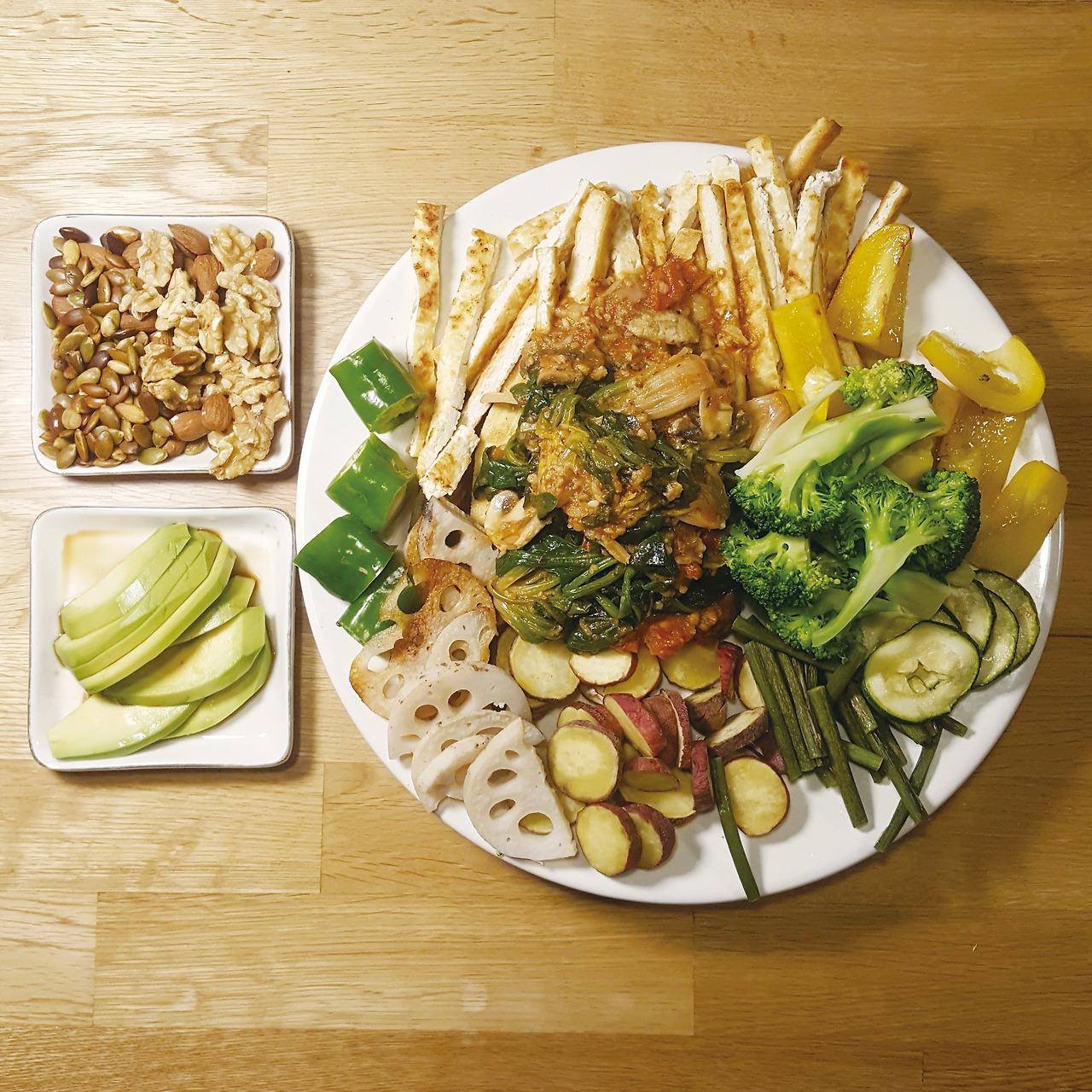 채소는 데치거나 오븐에 15분간 구웠고, 토마토에 시금치와 버섯을 넣어 파스타 소스를 만들어, 후라이팬에 올리브 오일을 두르고 구운 두부에 뿌려 먹었어요.
