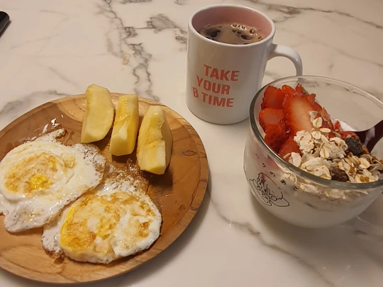 원래는 아침 6시에 일어나서 1시간 동안 씻고 드라이하고 화장하고 밥을 먹은 뒤, 집에서 나와 회사까지 약 1시간 반 정도 열심히 간다. 지하철과 도보로. 즉 출근을 위해 2시간 반이 소요된다. 매일매일. 하지만 이날은 7시에 일어났다. 항상 아침을 수제 요거트로 간단히 먹는데 이날은 조금 욕심을 부려서 차렸다.
