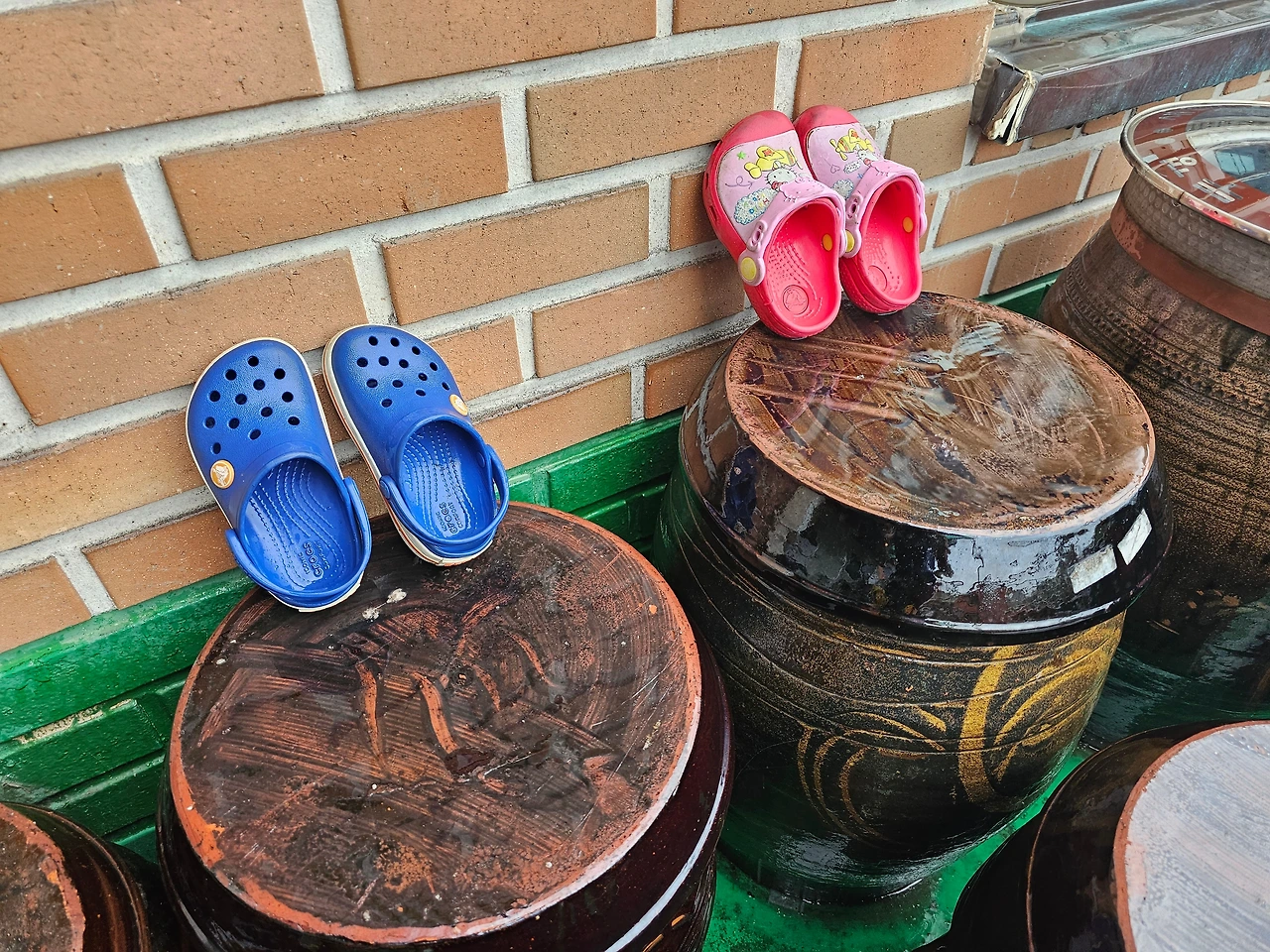 한반도를 수직으로 치고 올라오는 이번 태풍은 얼마나 험한 얼굴을 하고 있을지 걱정하는 나와는 달리 엄마를 따라 나온 꼬맹이는 비 맞으며 정리하는 것이 마냥 즐겁기만 하다. 점차 거세지는 바람에 서둘러 마무리를 하고 들어오는데 아이는 자신의 슬리퍼도 함께 깨끗이 만들어 주겠다며 해맑은 얼굴로 장독대 한편에 오빠 것과 자신의 빨간 슬리퍼를 비스듬히 세워 놓는다.