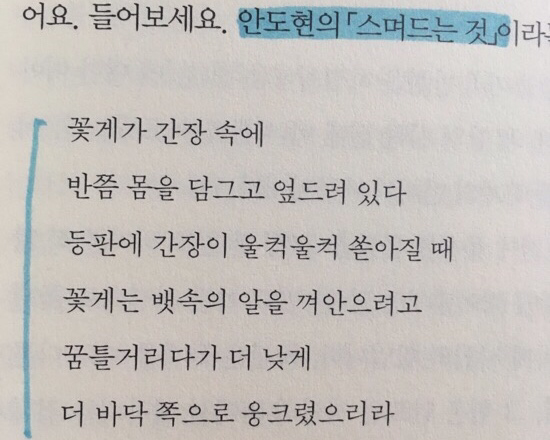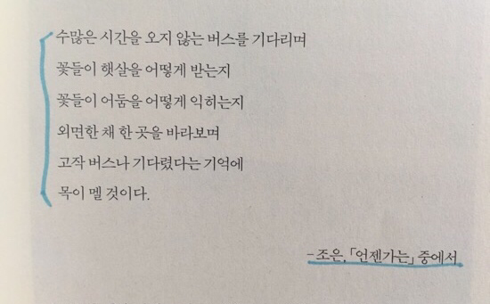 지금 이 순간, 현재에 의미를 부여하지 않으면 행복은 삶이 끝나갈 때쯤에나 찾게 될 겁니다. 순간에 의미를 부여해야 합니다. 그렇지 않으면 우리의 삶은 의미 없는 순간들의 합이 될 테니까요. 만약 삶은 순간의 합이라는 말에 동의하신다면, 찬란한 순간을 잡으세요. 나의 선택을 옳게 만드세요. 여러분의 현재를 믿으세요. 순간순간 의미를 부여하면 내 삶은 의미 있는 삶이 되는 겁니다. 순간에 이름을 붙여주고, 의미를 불어넣으면 모든 순간이 나에게 다가와 내 인생의 꽃이 되어줄 겁니다. 당신의 현재에 답이 있고, 그 답을 옳게 만들면서 산다면 김화영의 말대로 ‘티 없는 희열’을 매 순간 느낄 겁니다. 티 없는 희열로 빛나는 관능적인 기쁨에 들뜨는, 예외 없는 작은 조각들의 광채가 온전히 여러분의 인생을 빛내기를 바랍니다.