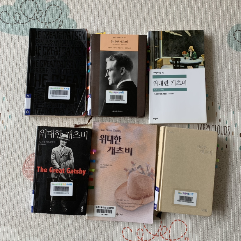 (나는 번역본을 읽을 때 여러 출판사의 번역본을 함께 비교하며 병행해 읽는 것을 좋아한다. 이번 개츠비의 경우, 굉장히 많은 번역본이 있었는데, 마음 같아선 모든 번역본을 다 비교하며 읽고 싶었지만 대출권수에 제한도 있었고, 시간도 많지 않았기에 일단 6권의 책만 빌려 병행독서를 했다. 주된 책으로는 민음사의 책을, 주 비교책으로는 인디북의 책을, 그리고 서브책으로 을유문화사, 열림원, 문학동네, 피카소, 킨들 어플을 통한 영문판 책들을 함께 읽었다. 주 책과 주 비교책은 완독을, 나머지 책들은 감명 깊은 구절이나 난해한 부분을 비교하여 읽었다. 개인적으로 민음사의 책은 원본과 가장 가깝게 번역되었다고는 하나 가독성이 떨어지는 아쉬움이 있었다. 아무래도 문학작품이다보니 읽는 즐거움에 대한 아쉬움은 크다. 그에 비해 인디북은 좀 더 매끄럽게 읽히는 점이 좋았다. 하지만 몇몇 번역에서 조금 가벼움이 느껴졌다. 소설가 김영하씨가 번역해 화제가 된 문학동네 책은 기대보다 많이 아쉬웠다. 소설가가 다른 이의 소설을 번역하는 것은 자칫 자신의 문체로 원본을 덧씌우는 우를 범할 수도 있겠다 싶은 생각이 들었다. 인기 번역가로 원작자보다 더 크게 띠지로 이름을 내걸고 홍보했던 김석희씨 번역의 열림원 책.... 가독성면에서는 좋았지만 번역가를 내세운 마케팅에 너무 기대감을 키운 건 아닌가 싶은 생각이 들었다. 김태우씨 번역의 을유문화사.... 어떤 면에선 이 책이 내가 읽기에는 가장 무난하지 않았나 싶다. 하지만, 내 취향엔, 민음사의 책을 주 책으로 하고 을유문화사나 인디북 등 다른 출판사의 책을 서브로 하여 함께 읽는 것이 더 좋을 듯 하다. 문체에도 각자의 취향이 있으니 여러 출판사의 번역본을 놓고 같은 부분을 읽어본 후 가장 마음에 드는 책을 골라 읽는 것도 좋은 방법일 것이다.)