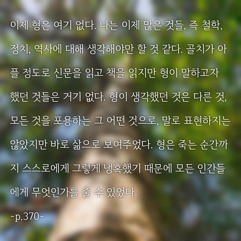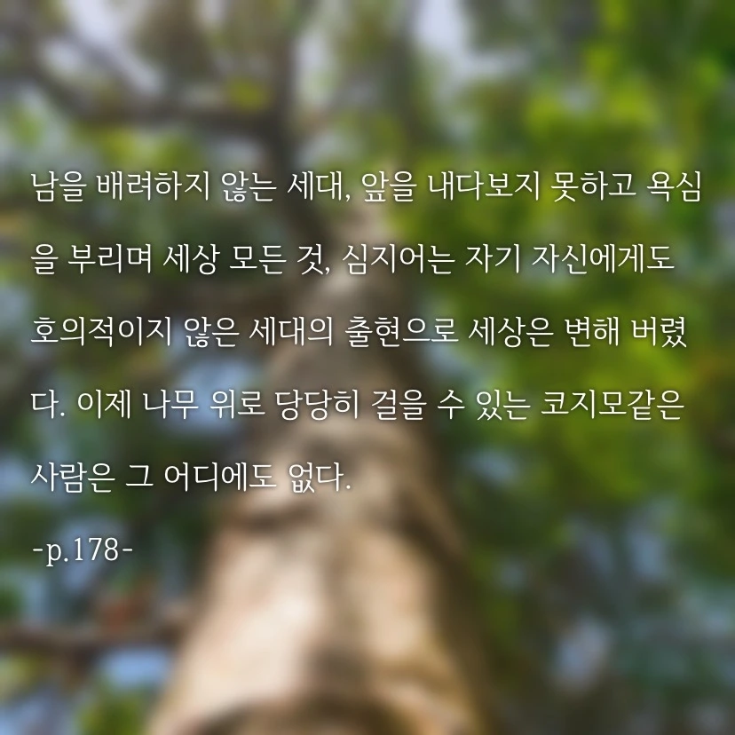 책을 읽으며 많은 생각이 오갔다. 단순히 그냥 나무 위에 올라 간 한 남자의 이야기가 아닌, 그를 통해 바라본 사람과 세상, 전쟁과 정치, 사랑과 삶이라는 온갖 일상적인 주제들이 꼬리를 물고 질문을 던진다.