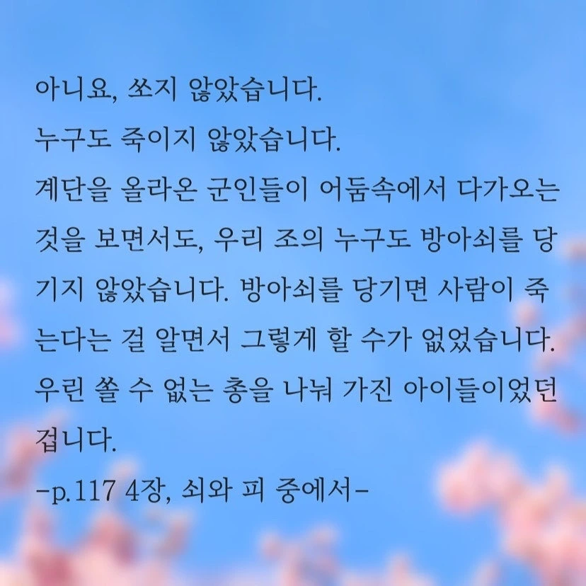 그저 담담히, 작가 자신처럼 너무나도 담담하고 차분하게, 때로는 그들을 바라보며, 때로는 그들 안에 들어가 조곤조곤 소곤소곤 그 날을 이야기하고 있다.