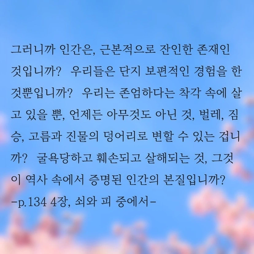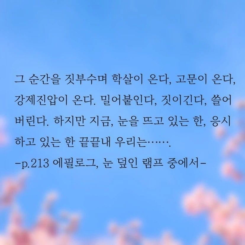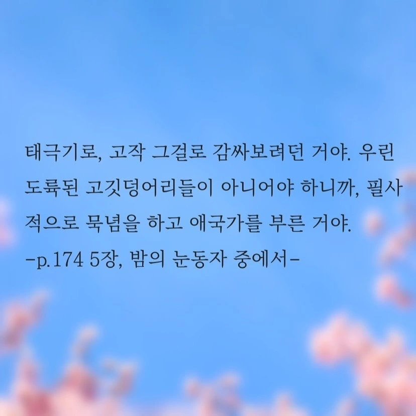 나는 <채식주의자> 책이 좋았다. 호불호가 많은 책이라 하는데, 폭력에의 저항으로 채식을 할 수 밖에 없었던 영혜가 좋았다. 공감이 되고, 이해가 되었다. 그래서였을까? 이 책 역시 나는 좋았다. <소년이 온다>는 <채식주의자>를 닮아있다. 총을 들고도 쏘지 못한 그들은 영혜를 닮았다. 나를 지키고 싶었지만 차마 너를 죽일 수도 없었던 그들은 영혜의 바람처럼 두 손이 땅에 깊이 박혀 민주주의라는 뿌리를 내리고, 무거운 다리를 하늘 끝까지 들어올려 다리 사이마다 자유의 가지를 뻗어낸 커다란 나무가 되었다.