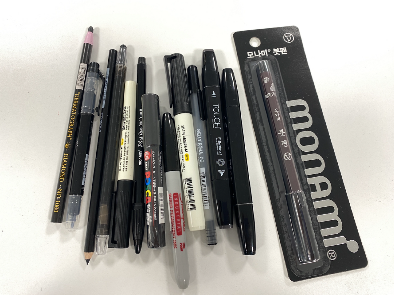 책상 위에 13개의 서로 다른 필기구들이 펼쳐졌다.