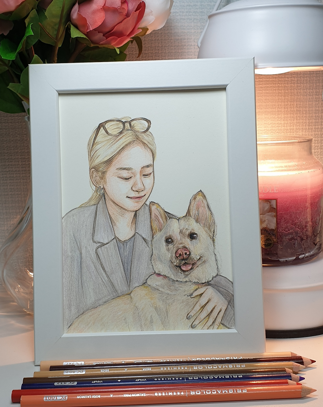 오후 10시, 세상에서 가장 행복한 알림 메시지, ‘색연필 인물화 작품 주문이 접수되었습니다’가 도착했다. 의뢰자 한분이 한꺼번에 2개를 동시에 주문한 건 처음이었다. 보내주신 사진 2장을 보고 나서 ‘아! 그래서 2개를 주문하셨구나!’하고 생각했다. 함께 키우고 있는 반려견과 함께 찍은 사진이었다. 한장은 반려견과 여자분 또 한장은 반려견과 남자분의 사진이고, 남매인 듯 보였다.